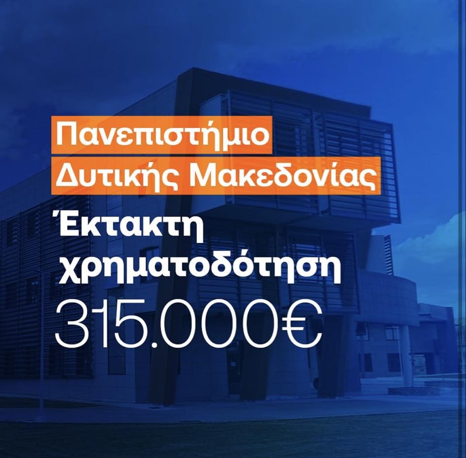 Με απόφαση της Υπουργού Παιδείας, Θρησκευμάτων και Αθλητισμού Σοφίας Ζαχαράκη, δρομολογείται έκτακτη χρηματοδότηση ύψους 315.000 ευρώ προς το Πανεπιστήμιο Δυτικής Μακεδονίας, με στόχο την αποκατάσταση των εκτεταμένων καταστροφών που υπέστησαν πανεπιστημιακές εγκαταστάσεις σε τέσσερις διαφορετικές πόλεις της Περιφέρειας, λόγω των ακραίων καιρικών φαινομένων της 30ής Αυγούστου 2025 και ενόψει της έναρξης του νέου ακαδημαϊκού έτους.