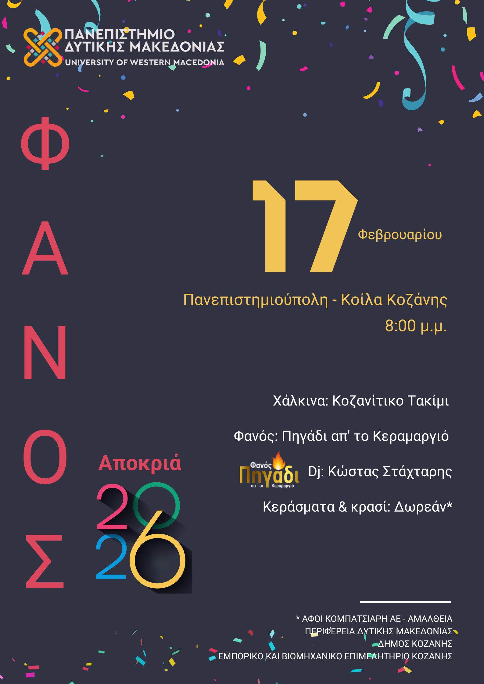 Φέτος, το Πανεπιστήμιο Δυτικής Μακεδονίας ανάβει και πάλι τον Φανό του, την Τρίτη 17 Φεβρουαρίου 2026, στις 20:00, στον χώρο της Πανεπιστημιούπολης στα Κοίλα Κοζάνης. Φοιτητές και φοιτήτριες από κάθε γωνιά της χώρας θα έχουν την ευκαιρία να ζήσουν από κοντά την Κοζανίτικη Αποκριά και να συμμετάσχουν στο έθιμο.