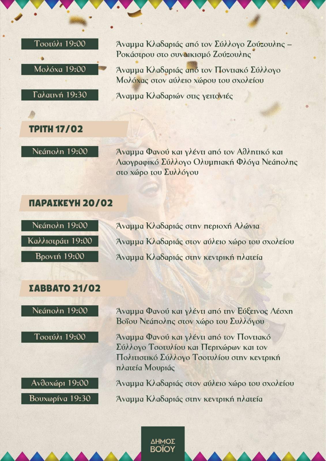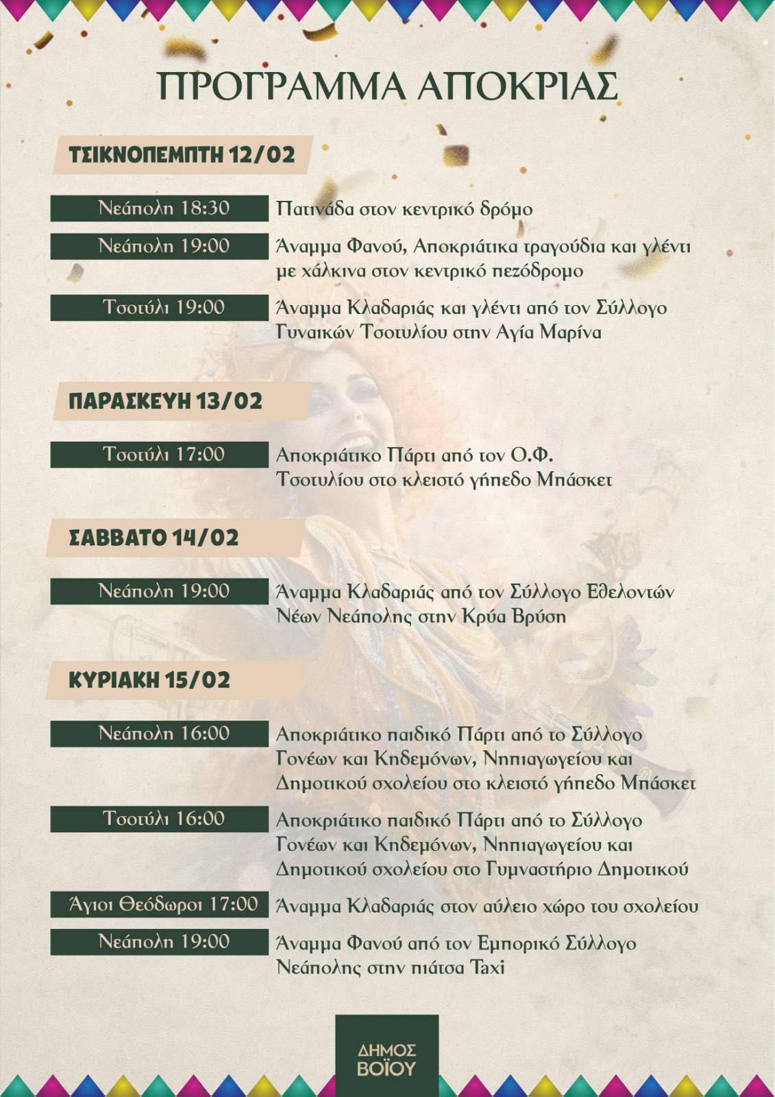 Με ένα πλούσιο εορταστικό πρόγραμμα υποδέχεται την Αποκριά ο Δήμος Βοΐου! Εκδηλώσεις θα πραγματοποιηθούν σε όλες τις Δημοτικές Κοινότητες με ημέρα έναρξης την Τσικνοπέμπτη!