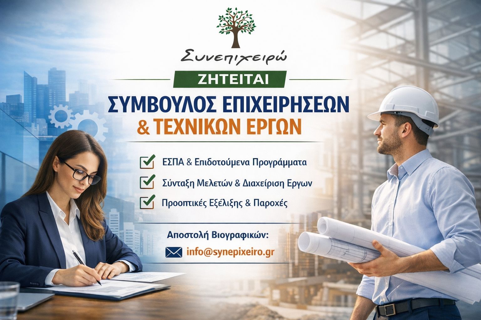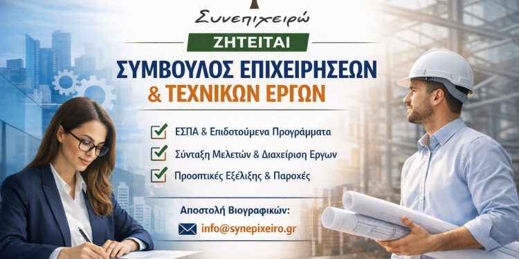 Η επιχείρηση «Συνεπιχειρώ Ε.Ε.», με έδρα την Κοζάνη και δυναμική παρουσία στον τομέα των επενδυτικών σχεδίων, της συμβουλευτικής επιχειρήσεων και της διαχείρισης τεχνικών έργων, αναζητά νέο συνεργάτη για ενίσχυση της ομάδας της με σύμβαση πλήρους απασχόλησης.