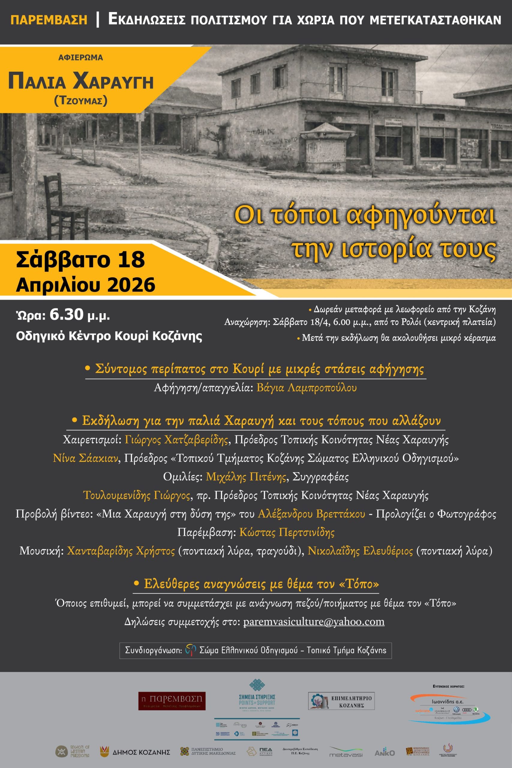 Μια ξεχωριστή εκδήλωση αφιερωμένη στην παλιά Χαραυγή θα πραγματοποιηθεί αύριο, Σάββατο 18 Απριλίου 2026, ώρα 18:30, στο Οδηγικό Κέντρο στο Κουρί Κοζάνης.