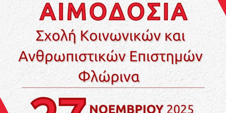 Την Πέμπτη 27 Νοεμβρίου 2025, από τις 09:00 έως 13:00, πραγματοποιείται εθελοντική αιμοδοσία στο Εργαστήριο Φυσικών Επιστημών της Σχολής Κοινωνικών και Ανθρωπιστικών Επιστημών του Πανεπιστημίου Δυτικής Μακεδονίας στη Φλώρινα.