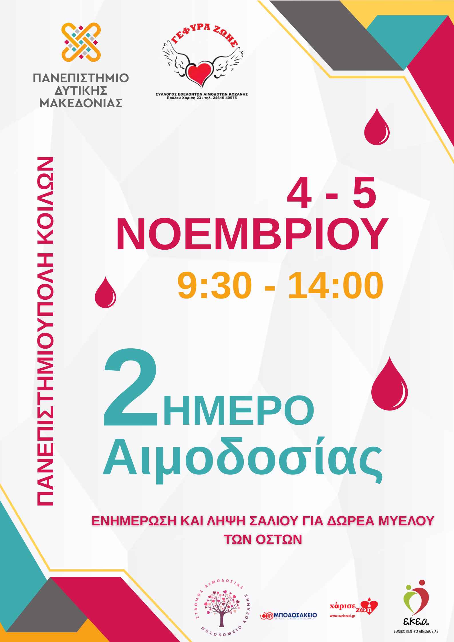 Παράλληλα, ο Σ.Ε.Α. Κοζάνης «Γέφυρα Ζωής», κόμβος-συνεργάτης του Κέντρου Εθελοντών Δοτών Μυελού των Οστών του Πανεπιστημίου Πατρών (ΚΕΔΜΟΠ), θα παίρνει δείγμα σάλιου απ’ όσους επιθυμούν να γίνουν δωρητές μυελού των οστών.
