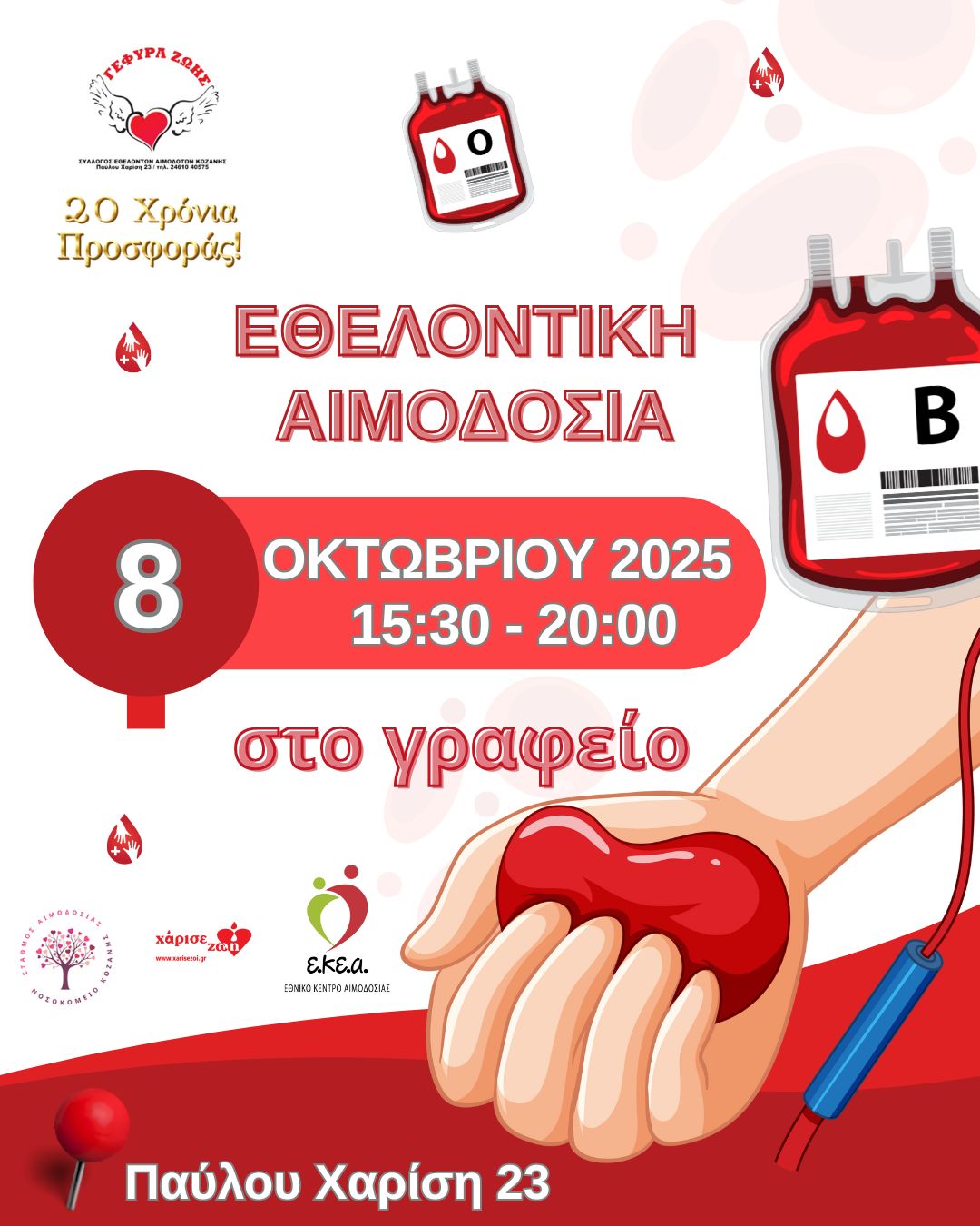 Την Τετάρτη 8 Οκτωβρίου 2025 από τις 15:30–20:00 (προσέλευση μέχρι 19:30) γίνεται αιμοδοσία στο γραφείο (Π. Χαρίση 23) με την συνεργασία της Αιμοδοσίας του Γ.Ν. Κοζάνης.