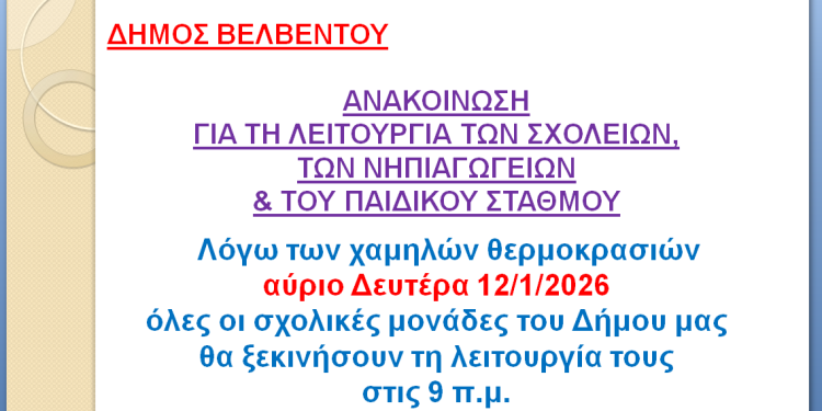 ΔΗΜΟΣ ΒΕΛΒΕΝΤΟΥΑΝΑΚΟΙΝΩΣΗΓΙΑ ΤΗ ΛΕΙΤΟΥΡΓΙΑ ΤΩΝ ΣΧΟΛΕΙΩΝ,ΤΩΝ ΝΗΠΙΑΓΩΓΕΙΩΝ& ΤΟΥ ΠΑΙΔΙΚΟΥ ΣΤΑΘΜΟΥΛόγω των χαμηλών θερμοκρασιώναύριο Δευτέρα 12/1/2026όλες οι σχολικές μονάδες του Δήμου μαςθα ξεκινήσουν τη λειτουργία τουςστις 9 π.μ.