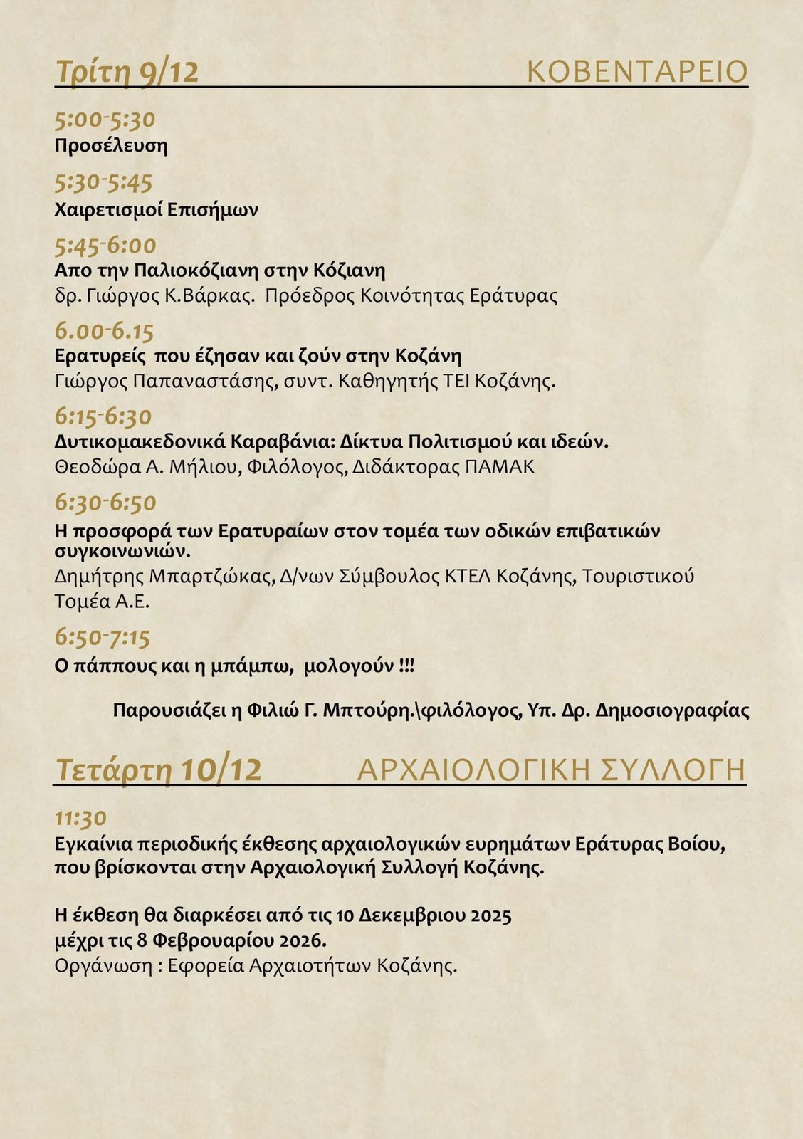 Ο Δήμος Βοΐου, σε συνδιοργάνωση με τον Δήμο Κοζάνης, την Τοπική Κοινότητα Εράτυρας και την Εφορεία Αρχαιοτήτων Κοζάνης, πραγματοποιεί τις εκδηλώσεις με τίτλο «Εβδομάδα Εράτυρας στην Κοζάνη», από Τρίτη 9 Δεκεμβρίου έως και Παρασκευή 12 Δεκεμβρίου.