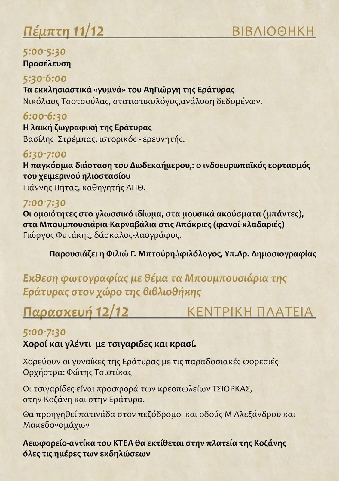 Οι δράσεις θα ολοκληρωθούν την Παρασκευή 12 Δεκεμβρίου, στην κεντρική Πλατεία Κοζάνης, με παραδοσιακούς χορούς, κρασί και τσιγαρίδες, δίνοντας το έναυσμα για την προετοιμασία των Μπουμπουσιαριών της Εράτυρας.