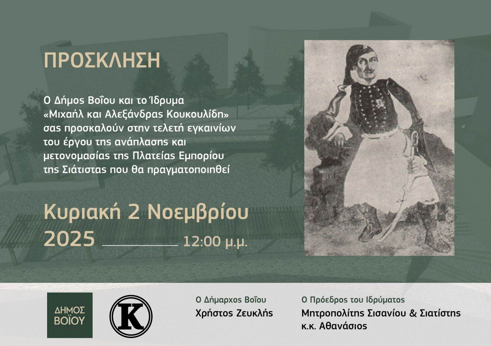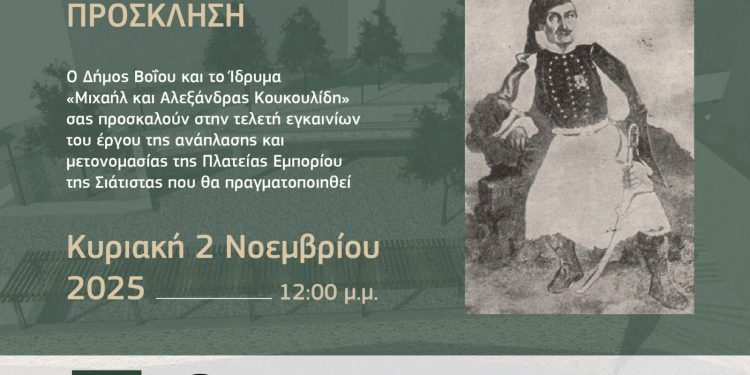 σας προσκαλούν στην τελετή εγκαινίων του έργου ανάπλασης και μετονομασίας της Πλατείας Εμπορίου Σιάτιστας.
