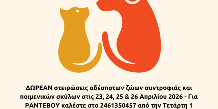 Στο πλαίσιο αυτό ο Δήμος καλεί όσους πολίτες μεριμνούν για τη σίτιση αδέσποτου ζώου συντροφιάς και επιθυμούν να στειρωθεί ο αδέσποτος σκύλος ή η γάτα που φροντίζουν, να επικοινωνήσουν από την Τετάρτη 1 Απριλίου 2026 στο υπηρεσιακό τηλέφωνο 2461350457, ώστε να ενημερωθούν σχετικά και να προγραμματίσουν ραντεβού, το αργότερο έως την Παρασκευή 17 Απριλίου 2026 και ώρα 14:00 το μεσημέρι.