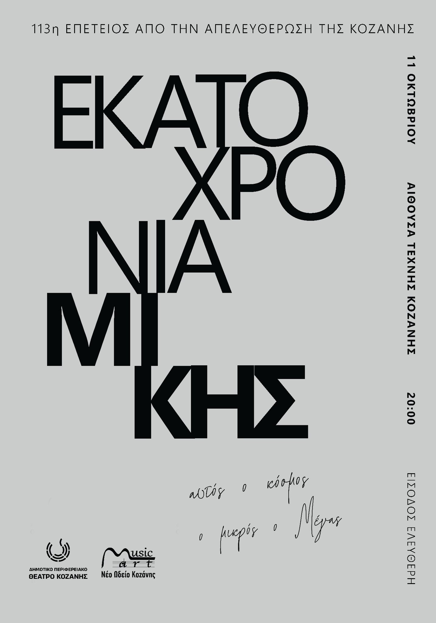 Το Δημοτικό Περιφερειακό Θέατρο Κοζάνης, στο πλαίσιο των δράσεων του open call, συνδιοργανώνει με το Νέο Ωδείο Κοζάνης – Musicart αφιέρωμα για τα 100 χρόνια από τη γέννηση του σπουδαίου συνθέτη Μίκη Θεοδωράκη με μία συναυλία αφιερωμένη στο πολυσχιδές έργο του. Το έργο αυτό ξεπερνά τα σύνορα της μουσικής δημιουργίας και γίνεται το ίδιο πολιτισμός, ιστορία και συλλογική μνήμη.