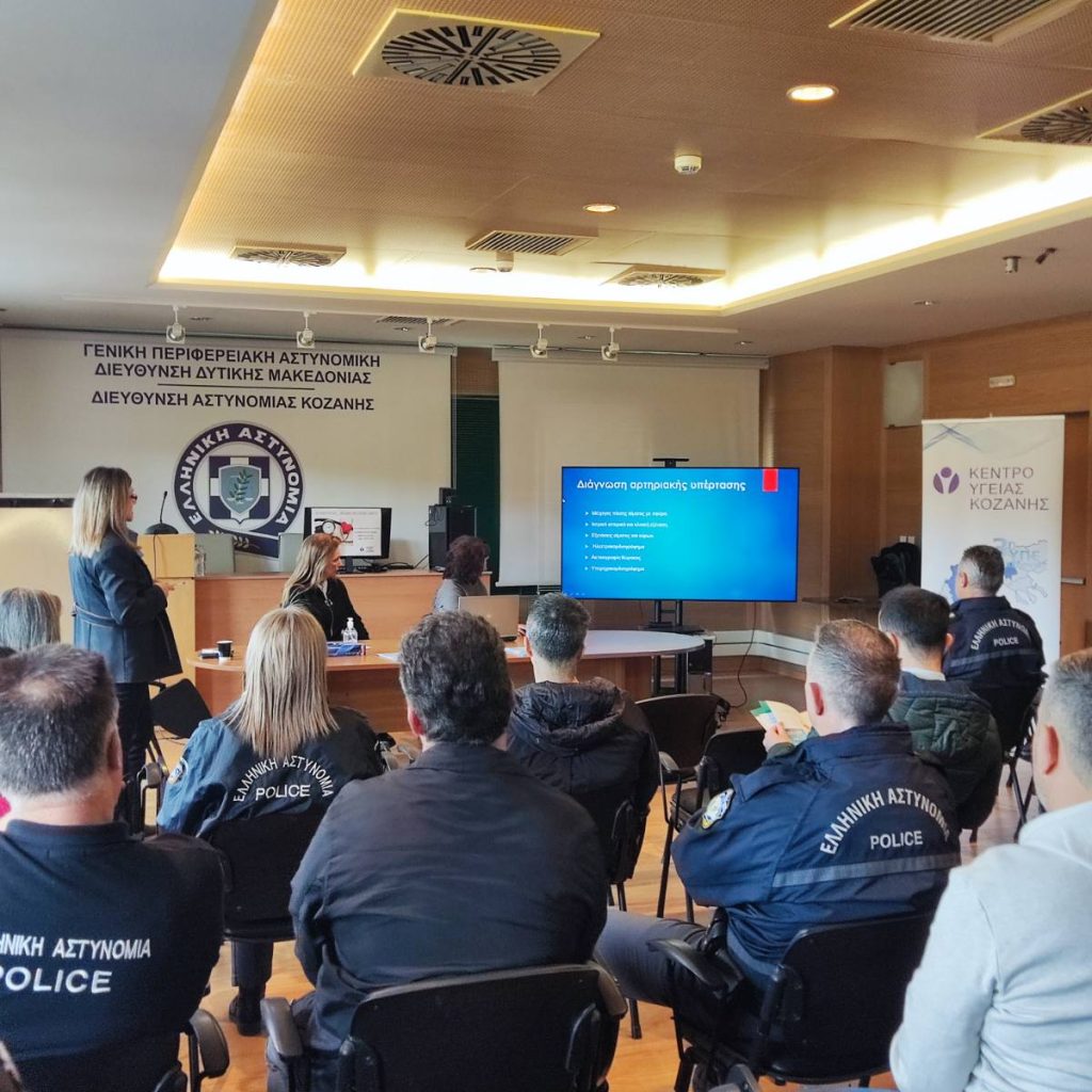 Στην αίθουσα πολλαπλών χρήσεων του Αστυνομικού Μεγάρου Κοζάνης, πραγματοποιήθηκε ενημερωτική διάλεξη με θέμα την αρτηριακή πίεση. Η εκδήλωση διοργανώθηκε από το ιατρικό προσωπικό του Κέντρου Υγείας Κοζάνης, μετά από πρόσκληση της Διεύθυνσης Αστυνομίας Κοζάνης, και είχε ως στόχο την ενημέρωση και ευαισθητοποίηση των αστυνομικών σχετικά με τους κινδύνους της αρτηριακής υπέρτασης, τους τρόπους πρόληψης και τη σωστή διαχείριση της πάθησης.