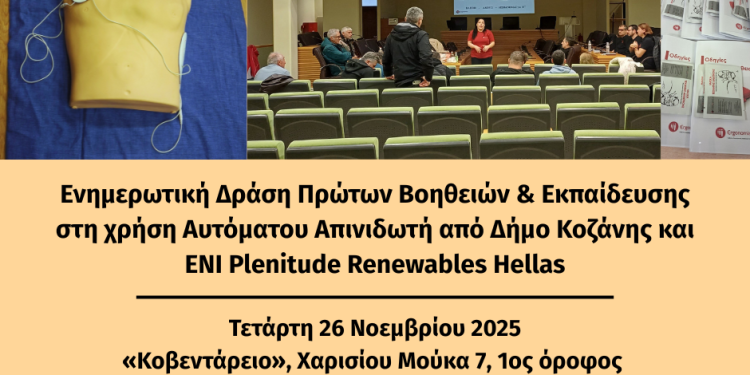 Ο Δήμος Κοζάνης με την ευγενική υποστήριξη της ENI Plenitude Renewables Hellas, διοργανώνει ενημερωτική δράση Πρώτων Βοηθειών & Εκπαίδευσης στη χρήση Αυτόματου Απινιδωτή, με στόχο την ενίσχυση της ετοιμότητας της τοπικής κοινότητας και την απόκτηση βασικών δεξιοτήτων αντιμετώπισης επειγόντων περιστατικών.