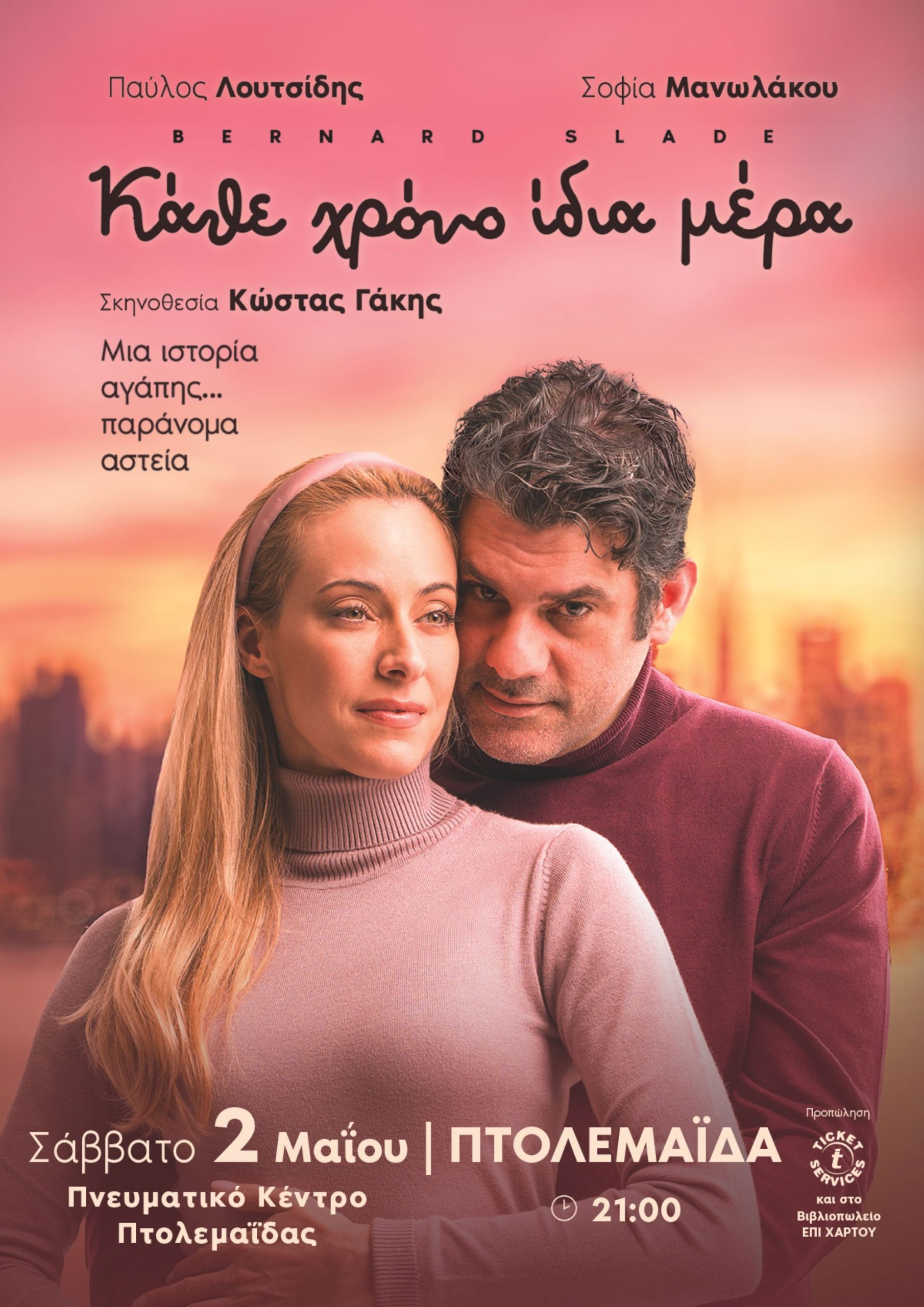 Μετά την επιτυχία της παράστασης “Ο φίλος μου ο Ντοστογιέφσκι” και τα πολυάριθμα ταξίδια της σε όλη την Ελλάδα η ίδια δημιουργική τριάδα (Παύλος Λουτσίδης, Κώστας Γάκης, Νατάσα Φαίη Κοσμίδου) ξαναχτυπά με την νέα καλλιτεχνική της κατάθεση, την σπιρτόζικη, ρομαντική κωμωδία “Κάθε χρόνο ίδια μέρα”. Το πολυβραβευμένο θεατρικό έργο του Βernard Slade πρωτοπαρουσιάστηκε στην Ελλάδα από τον Αλέκο Αλεξανδράκη και τη Νόνικα Γαληνέα αποκτά τώρα τελείως διαφορετική ταυτότητα, ρυθμολογία και αισθητική με τις δυναμικές ερμηνείες της Σοφίας Μανωλάκου και του Παύλου Λουτσίδη, δύο ηθοποιών που μετατρέπουν το δωμάτιο του ξενοδοχείου σε ένα πεδίο μάχης με έντονη σωματικότητα, μεγάλες δόσεις χιούμορ και στιγμές σπάνιας ανθρωπιάς η οποία λειτουργεί ως μια ανάσα ανακούφισης στους κυνικούς ρυθμούς και την απονέκρωση των συναισθημάτων του σήμερα.