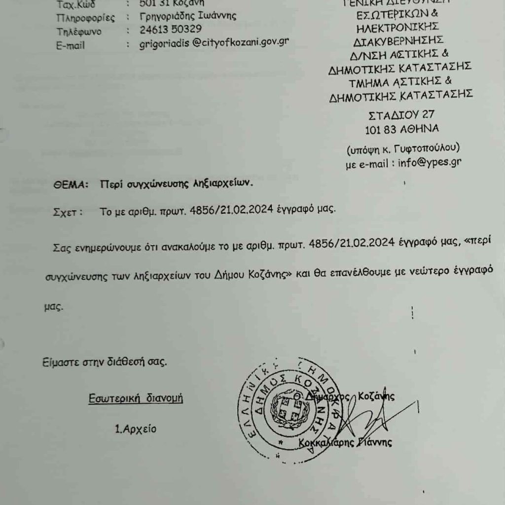 Επιβεβαίωση του Kozanimedia από το Υπουργείο Εσωτερικών για το ληξιαρχείο Αιανής: “Υπάρχει νεότερο έγγραφο από το Δήμο Κοζάνης με το οποίο ζητείται η συγχώνευση”-Θα δώσει το επίμαχο έγγραφο στη δημοσιότητα η δημοτική αρχή Κοκκαλιάρη;