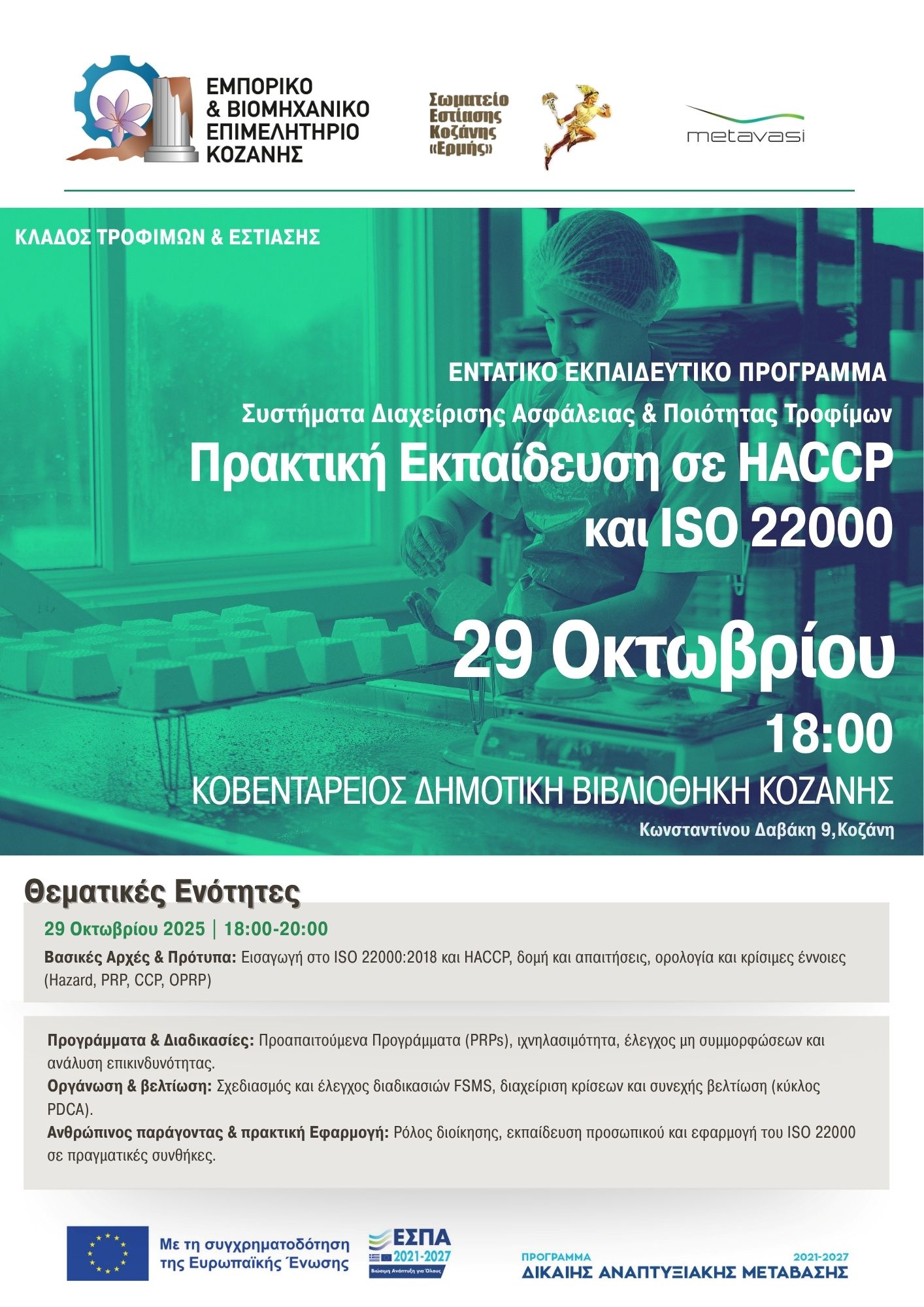 Η Μετάβαση Μ.Α.Ε., σε συνεργασία με το Επιμελητήριο Κοζάνης και το Σωματείο Καφετεριών και Εστίασης Κοζάνης «Ο Ερμής», προχωρούν στην έναρξη ενός νέου, σύγχρονου επιμορφωτικού προγράμματος με τίτλο «Ασφάλεια & Ποιότητα Τροφίμων στην Πράξη – Εκπαίδευση σε ISO 22000:2018 & HACCP», το οποίο πραγματοποιείται στο πλαίσιο των επιμορφωτικών δράσεων των Κέντρων Ανάπτυξης Δεξιοτήτων και Απασχόλησης.