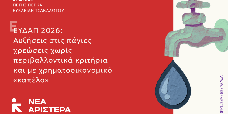 Ερώτηση για τις αυξήσεις που εφαρμόζει η ΕΥΔΑΠ από την 1η Ιανουαρίου 2026 στα πάγια ύδρευσης και αποχέτευσης, οι οποίες φτάνουν σε συνολική μηνιαία επιβάρυνση 2,48 ευρώ στους λογαριασμούς, κατέθεσαν εννέα (9) Βουλευτές της Νέας Αριστεράς, με πρωτοβουλία της Βουλεύτριας Φλώρινας και Γραμματέα της ΚΟ, Πέτης Πέρκα, και του Βουλευτή B1 Βόρειου Τομέα, Ευκλείδη Τσακαλώτου.