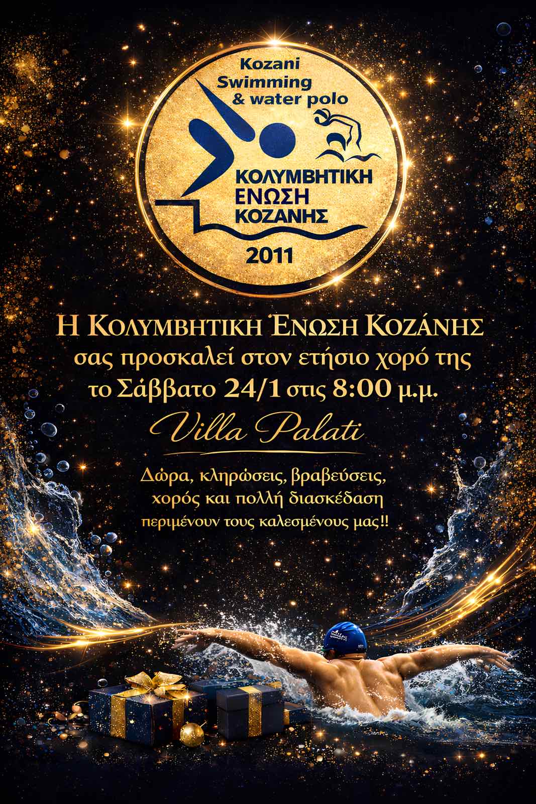 Η Κολυμβητική Ένωση Κοζάνης, σας προσκαλεί στον ετήσιο χορός της για το 2026, το Σάββατο 24 Ιανουάριου στις 20:00, στο «Villa Palati».