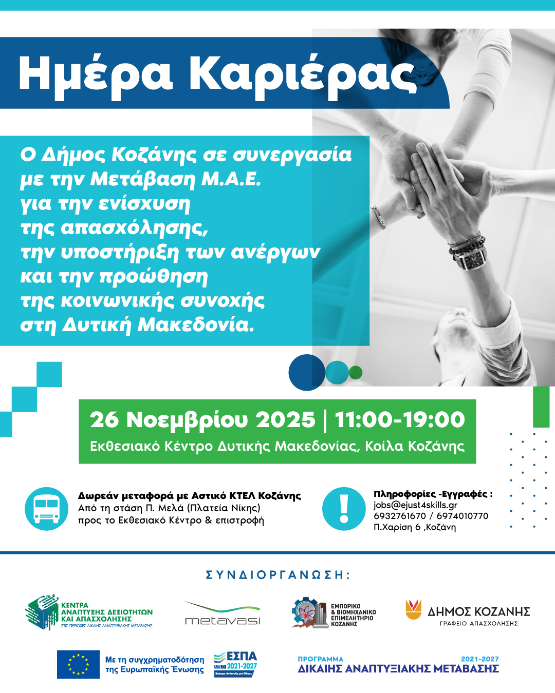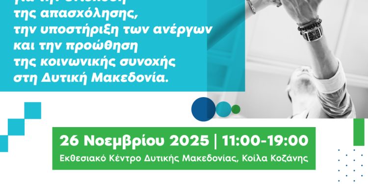 Ο Δήμος Κοζάνης, η Μετάβαση Μ.Α.Ε. και το Επιμελητήριο Κοζάνης, σε συνεργασία με το Πανεπιστήμιο Δυτικής Μακεδονίας, διοργανώνουν την Ημέρα Καριέρας & Δικτύωσης με την τοπική αγορά εργασίας, την Τετάρτη 26 Νοεμβρίου 2025, από τις 11:00 έως τις 19:00, στο Εκθεσιακό Κέντρο Δυτικής Μακεδονίας στα Κοίλα Κοζάνης.