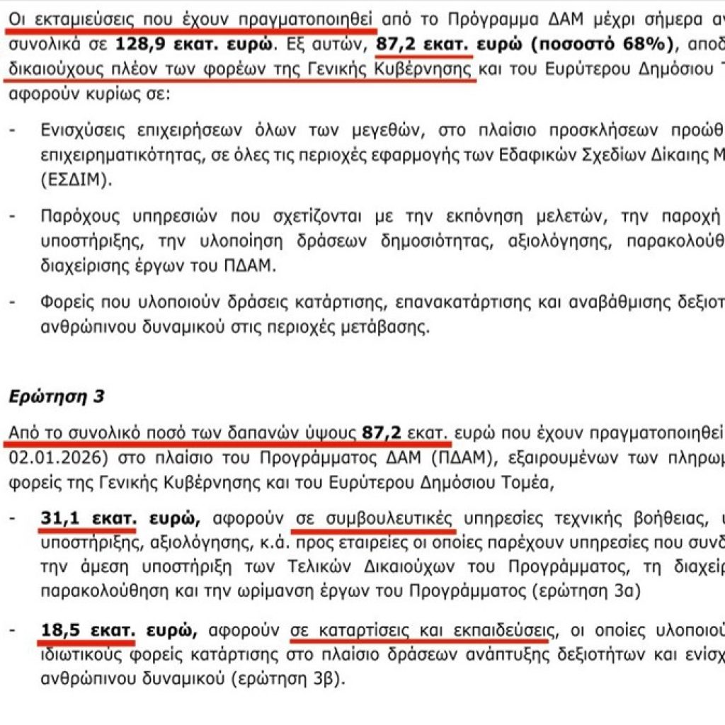 Τους ακριβείς αριθμούς για την πραγματική απορρόφηση του “Προγράμματος Δίκαιης Αναπτυξιακής Μετάβασης 2021 – 2027” (ΠΔΑΜ) έδωσε επίσημα στη Βουλή στον Πάρι Κουκουλόπουλο ο Αναπληρωτής Υπουργός Εθνικής Οικονομίας & Οικονομικών, κ. Ν. Παπαθανάσης, απαντώντας στην αριθμ. 2170/2.1.2026 Ερώτηση του Βουλευτή Κοζάνης με θέμα «Αναπάντητα τα ερωτήματα για την απελπιστικά χαμηλή απορρόφηση του ΠΔΑΜ και ειδικότερα για τις πληρωμές σε συμβούλους και εξ Αθηνών καταρτίσεις». Οι αριθμοί μιλούν από μόνοι τους.