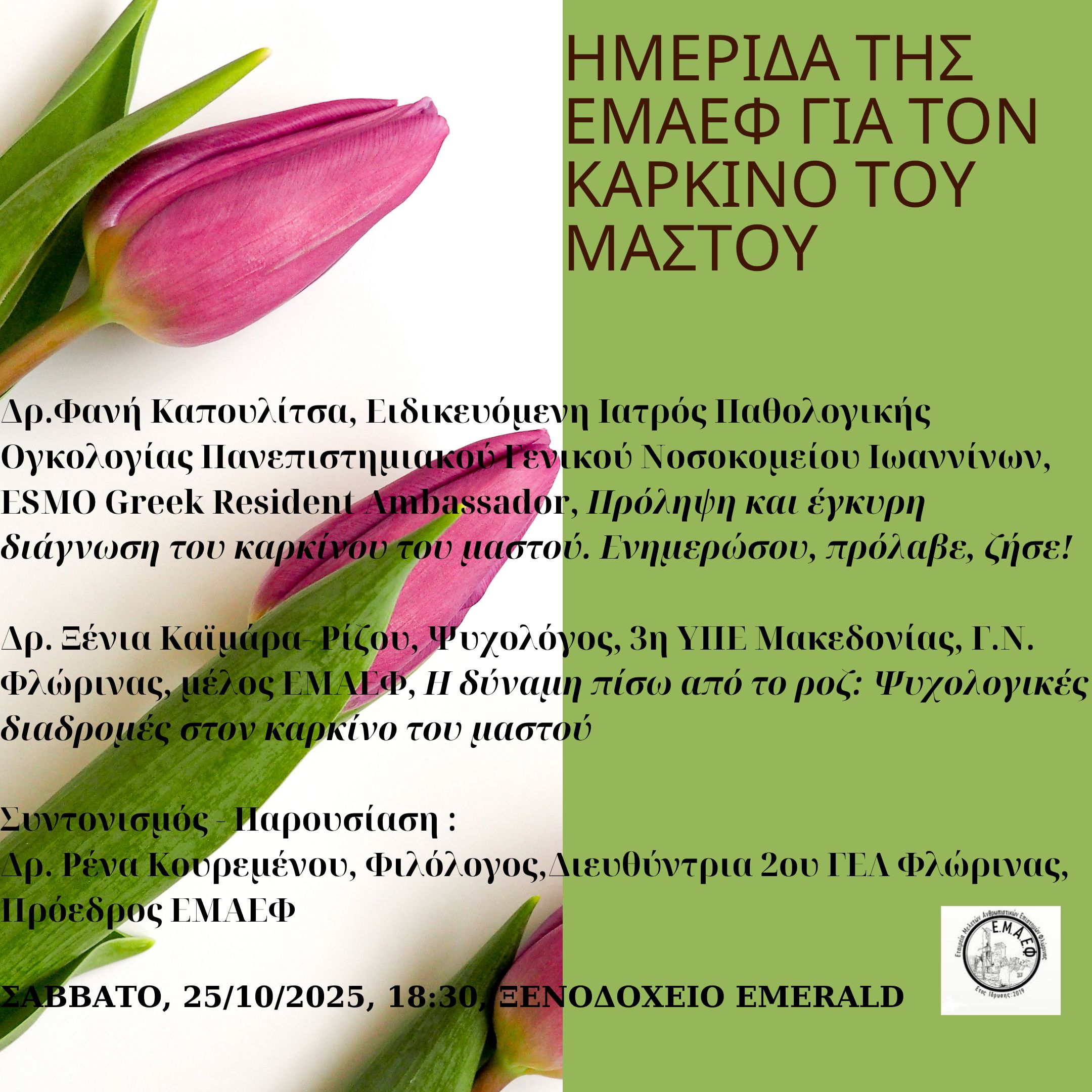 Η Εταιρεία Μελετών Ανθρωπιστικών Επιστημών Φλώρινας (ΕΜΑΕΦ) σας προσκαλεί στην Ημερίδα για τον καρκίνο του μαστού, που θα πραγματοποιηθεί το Σάββατο, 25-10-2025 και ώρα 18:30 στο ξενοδοχείο EMERALD με σκοπό την ενημέρωση και ευαισθητοποίηση του κοινού σχετικά με αυτή τη σοβαρή ασθένεια.