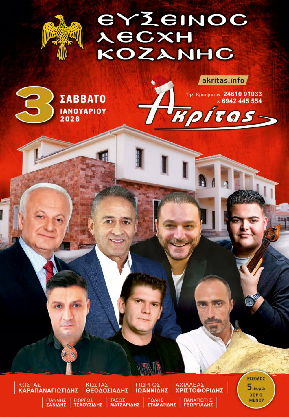 Η Εύξεινος Λέσχη Κοζάνης σας προσκαλεί στον ετήσιο καθιερωμένο χορό της, που θα διεξαχθεί το Σάββατο 3 Ιανουαρίου στο κέντρο “Ακρίτας” για να χορέψουμε, να τραγουδήσουμε, να ανταλλάξουμε ευχές και να υποδεχτούμε το νέο χρόνο με ευετηριακή διάθεση και αισιοδοξία!