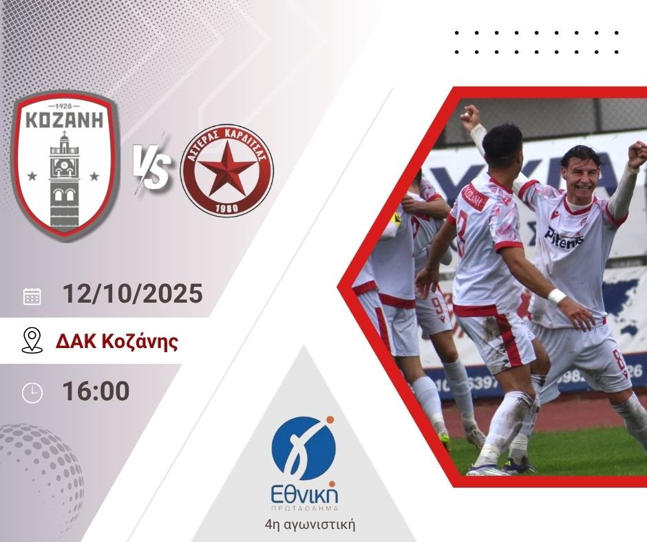 Το ΔΑΚ Κοζάνης ετοιμάζεται να ζήσει μια Κυριακή γεμάτη ένταση και συγκινήσεις! ΤΟ.Φ.Σ Κοζάνης υποδέχεται τον Αστέρα Καρδίτσας για τη 4η αγωνιστική της Γ’ Εθνικής (2ος Όμιλος) την Κυριακή, 12 Οκτωβρίου 2025, στις 4:00 μ.μ.