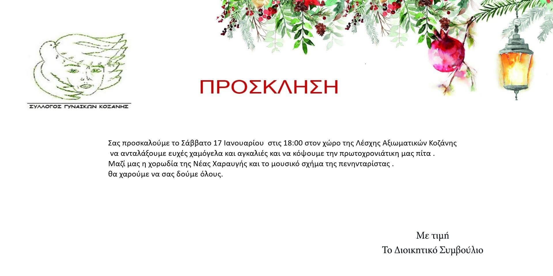 Σας προσκαλούμε στην ετήσια κοπή της πρωτοχρονιάτικης πίτας Όλοι εμείς μέλη του Σύλλογου ,πολυαριθμοι φίλοι ,Συνοδοιπόροι του Συλλόγου Γυναικών Κοζανης θα ξαναβρεθούμε στο ζεστο χωρο της Λέσχης Αξιωματικών Κοζάνης να ανταλλάξουμε ευχές χαμόγελα αγκαλιές.
