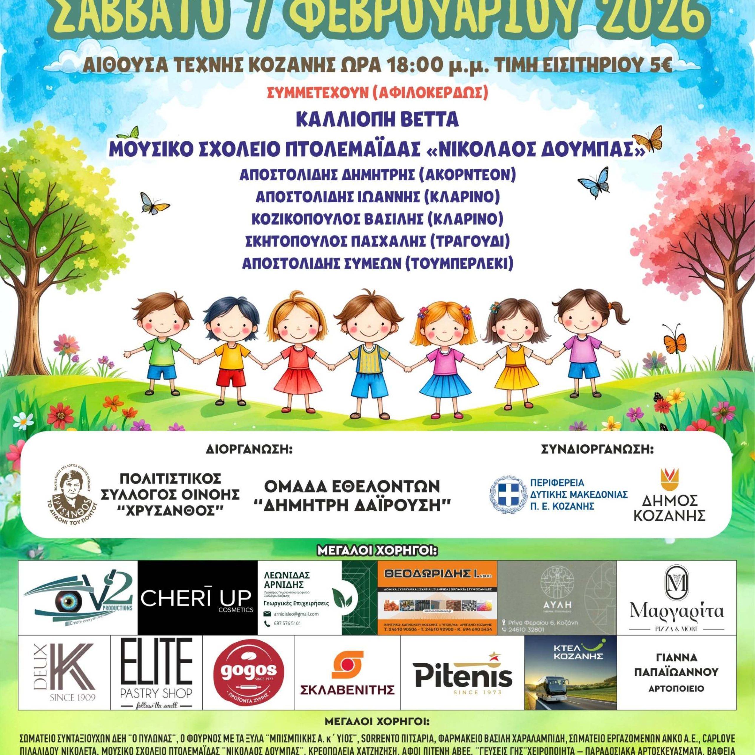 Η εκδήλωση θα πραγματοποιηθεί το Σάββατο 7 Φεβρουαρίου 2026 στην Αίθουσα Τέχνης του Δήμου Κοζάνης στις 18.00 μμ και ΟΛΑ τα έσοδα θα διατεθούν σε επτά (7) παιδιά με πολύ σοβαρά προβλήματα υγείας.