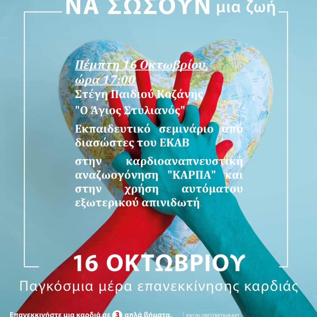 Η Στέγη Παιδιού Κοζάνης «ο Άγιος Στυλιανός» σε συνεργασία με το ΕΚΑΒ καλούν όλους στην εκδήλωση που θα γίνει στην αίθουσα εκδηλώσεων της Στέγης Παιδιού Κοζάνης (Βας. Φόρη 36) την Πέμπτη 16 Οκτωβρίου και ώρα 5:00 με σκοπό την ενημέρωση του κοινού για την ΚΑΡΠΑ, μια βασική τεχνική παροχής πρώτων βοηθειών καθώς επίσης και για την εκμάθηση της χρήσης του ΑΕΑ (Αυτόματου Εξωτερικού Απινιδωτή), συσκευή που μπορεί να επαναφέρει τον καρδιακό ρυθμό και να αυξήσει σημαντικά τις πιθανότητες επιβίωσης σε περίπτωση καρδιακού επεισοδίου.