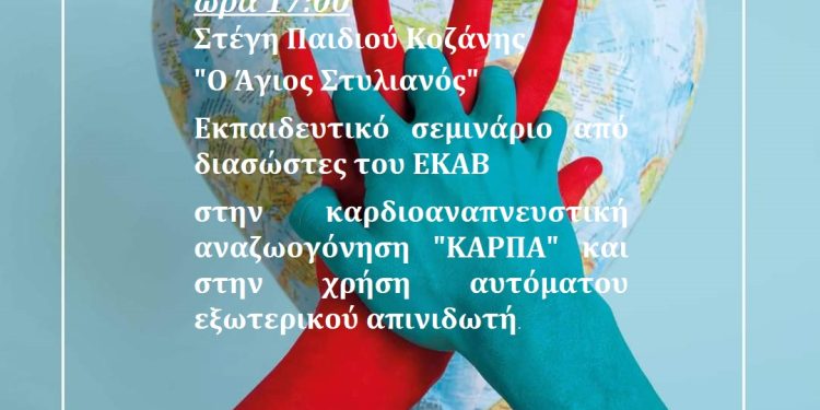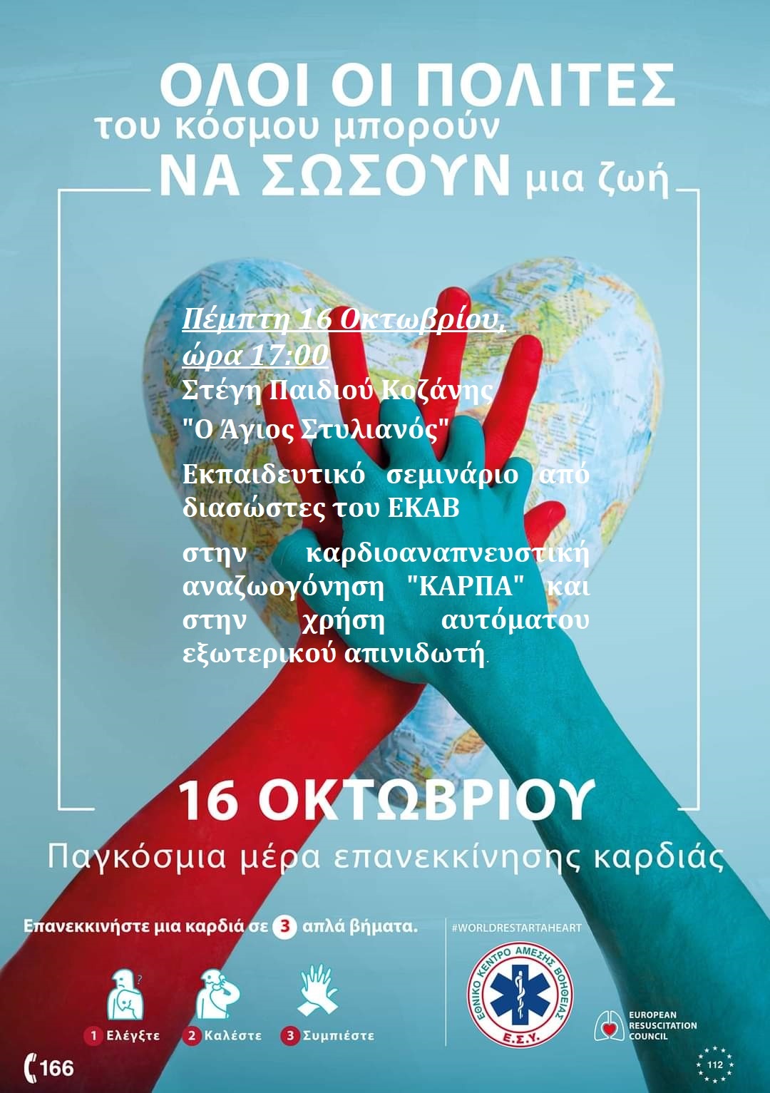 Η Στέγη Παιδιού Κοζάνης «ο Άγιος Στυλιανός» σε συνεργασία με το ΕΚΑΒ καλούν όλους στην εκδήλωση που θα γίνει στην αίθουσα εκδηλώσεων της Στέγης Παιδιού Κοζάνης (Βας. Φόρη 36) την Πέμπτη 16 Οκτωβρίου και ώρα 5:00 με σκοπό την ενημέρωση του κοινού για την ΚΑΡΠΑ, μια βασική τεχνική παροχής πρώτων βοηθειών καθώς επίσης και για την εκμάθηση της χρήσης του ΑΕΑ (Αυτόματου Εξωτερικού Απινιδωτή), συσκευή που μπορεί να επαναφέρει τον καρδιακό ρυθμό και να αυξήσει σημαντικά τις πιθανότητες επιβίωσης σε περίπτωση καρδιακού επεισοδίου.