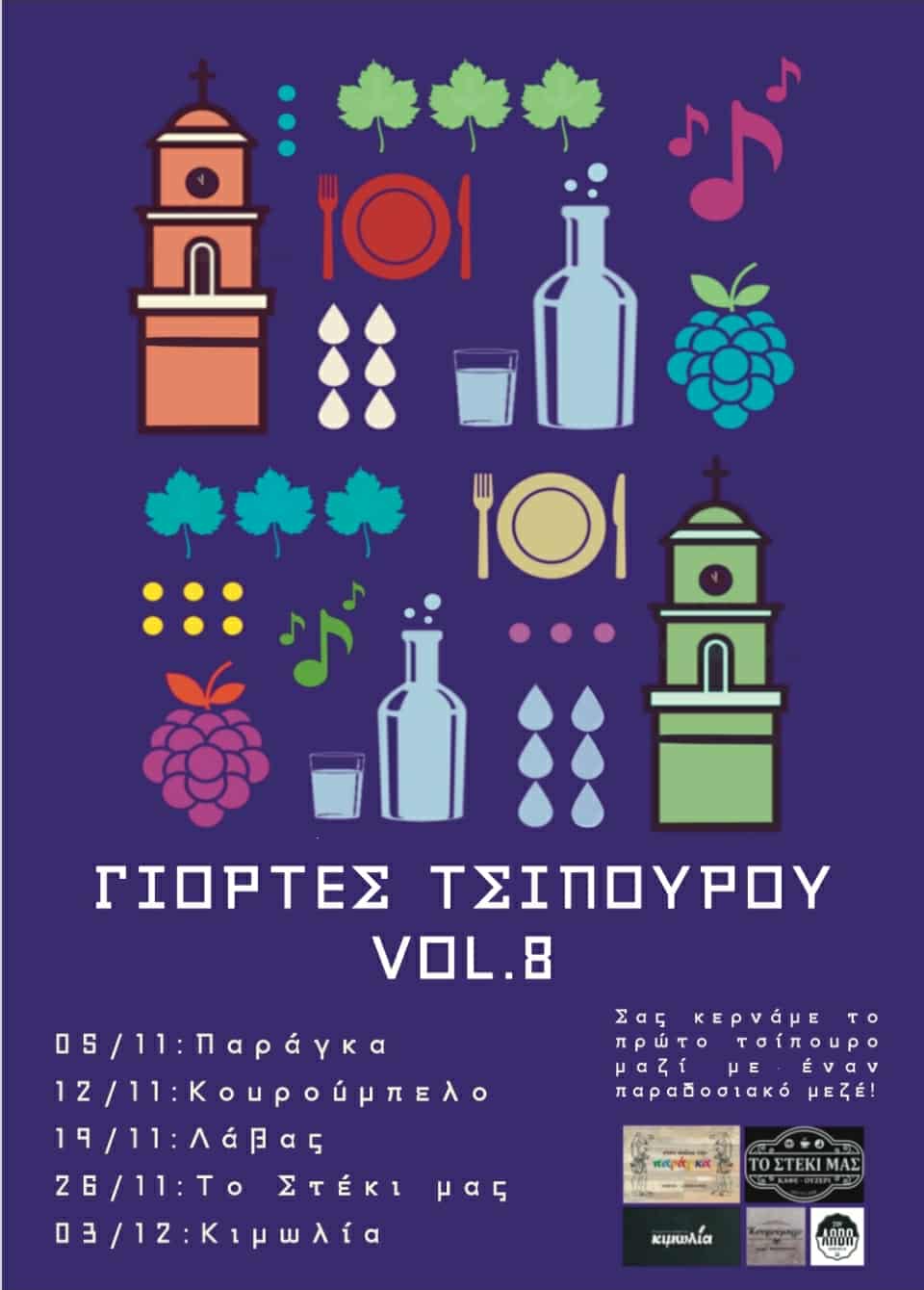 Κάθε Τετάρτη, ένα μαγαζί της πόλης φιλοξενεί τις όγδοες παρακαλώ, Γιορτές Τσίπουρου. Το φορμάτ γνωστό πλέον. Το πρώτο τσιπουράκι κερασμένο κι ένα πιάτο ειδικά για τη μέρα. Πέντε μεγαθήρια του μεζέ, πέντε ογκόλιθοι της ρακής μας υποδέχονται από το μεσημέρι κάθε Τετάρτης για να μας ταξιδέψουν με γεύσεις και αρώματα στο δρόμο με τις αυξημένες τρανσαμινάσες. Φήμες που θέλουν και guest εμφανίσεις παλιών συμμετεχόντων στο δρώμενο παραμένουν ανεπιβεβαίωτες.