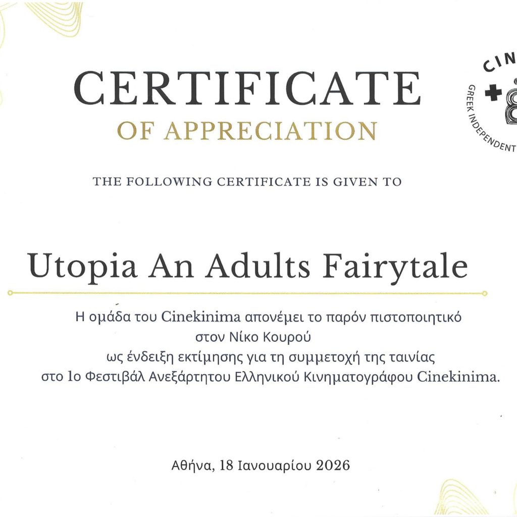 Μπορεί να έχουν περάσει δέκα χρόνια από τότε που η πρώτη μεγάλου μήκους ταινία του Νίκου Κουρού, «Ουτοπία, παραμύθι για ενήλικες», κυκλοφόρησε στα διεθνή κινηματογραφικά φεστιβάλ, ωστόσο η πορεία της εξακολουθεί να είναι ενδιαφέρουσα σε φεστιβάλ και προβολές, αποδεικνύοντας τη διαχρονικότητα της. Κάτι που αναφέρθηκε από πολλούς θεατές στις προβολές της περασμένης Κυριακής 18/1/2026, στο 1ο Φεστιβάλ Ανεξάρτητου Ελληνικού Κινηματογράφου στον ιστορικό κινηματογράφο της Αθήνας Studio New Star Art Cinema, αλλά και στην Κινηματογραφική Λέσχη Κορινθίας, στο Διεθνές Κέντρο Πολιτισμού Petrosophy, στους Αγίους Θεοδωρους Κορινθίας. Ο σκηνοθέτης Νίκος Κουρού, κατάφερε να είναι παρών και στις δύο προβολές της ημέρας, εισπράττοντας ένθερμα σχόλια από τους θεατές αλλά και τους διοργανωτές των φεστιβάλ και προβολών, που έδειξαν το ενδιαφέρον τους για προβολές και άλλων ταινιών του στο εγγύς μέλλον. Οι διοργανωτές του 1ου Φεστιβάλ Ανεξάρτητου Ελληνικού Κινηματογράφου του απένειμαν ειδική τιμητική μνεία, ως ένδειξη εκτίμησης για τη συμμετοχή της ταινίας του. Επιπλέον, η Κινηματογραφική Λέσχη Κορινθίας, αναμένεται να προβάλει την τρίτη μεγάλου μήκους ταινία του, τη «Σκοτοδίνη», μέσα στο Φλεβάρη.