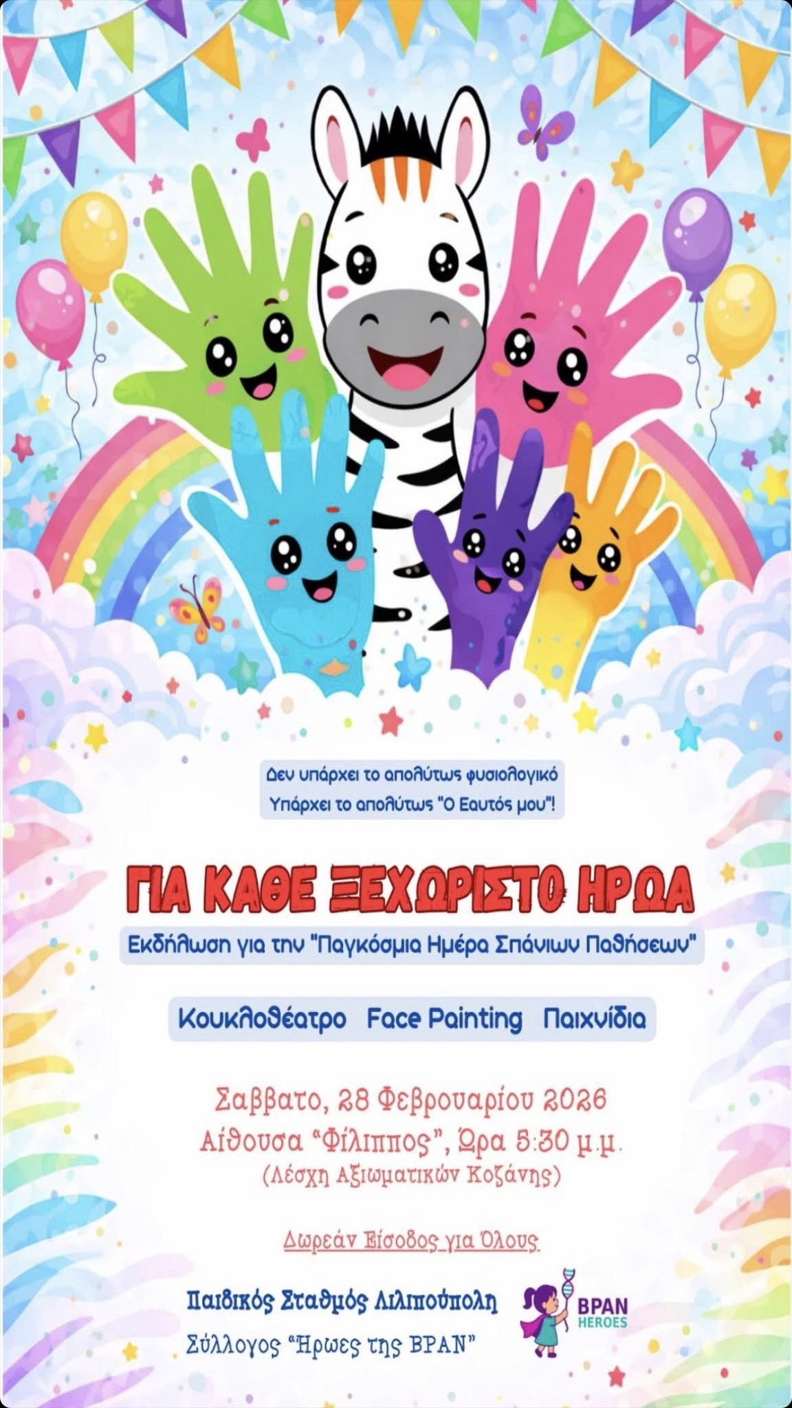 Ο Παιδικός Σταθμός Λιλιπούπολη και ο Σύλλογος «Ήρωες της BPAN» συνδιοργανώνουν το Σάββατο 28 Φεβρουαρίου 2026 και ώρα 17:30, στην Αίθουσα «Φίλιππος» (Λέσχη Αξιωματικών Κοζάνης), μια ανοιχτή εκδήλωση αφιερωμένη στην Παγκόσμια Ημέρα Σπάνιων Παθήσεων με τίτλο: