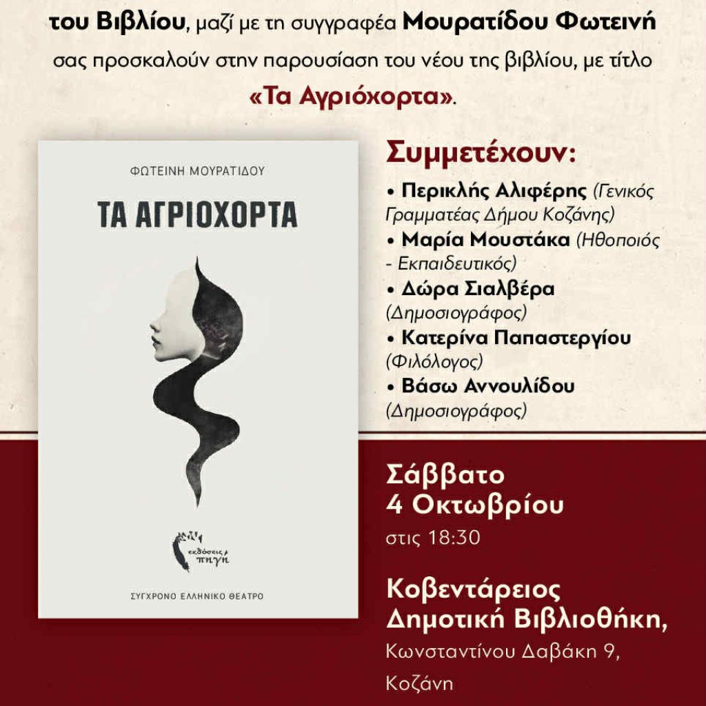 Η παρουσίαση θα πραγματοποιηθεί το Σάββατο 4 Οκτωβρίου, στις 18:30, στην Κοβεντάρειο Δημοτική Βιβλιοθήκη Κοζάνης (Κωνσταντίνου Δαβάκη 9).