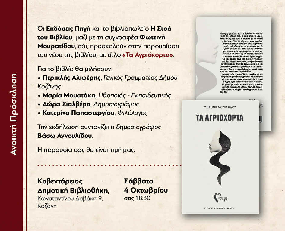 Οι Εκδόσεις Πηγή και το βιβλιοπωλείο Η Στοά του Βιβλίου, σε συνεργασία με τη συγγραφέα Φωτεινή Μουρατίδου, διοργανώνουν εκδήλωση για την παρουσίαση του νέου της βιβλίου με τίτλο «Τα Αγριόχορτα».