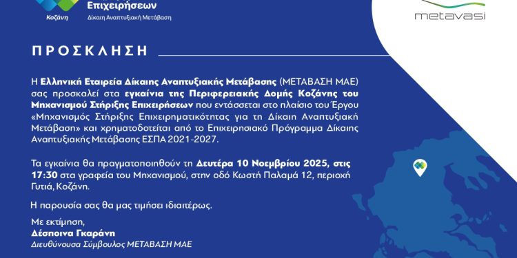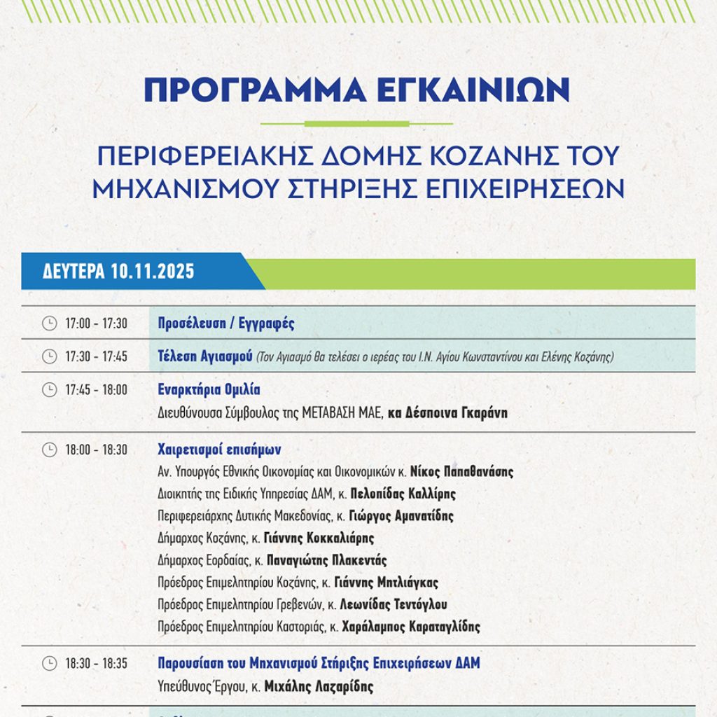 Τα εγκαίνια θα πραγματοποιηθούν τη Δευτέρα 10 Νοεμβρίου 2025, στις 17:30 στα γραφεία του Μηχανισμού, στην οδό Κωστή Παλαμά 12, περιοχή Γιτιά, Κοζάνη.