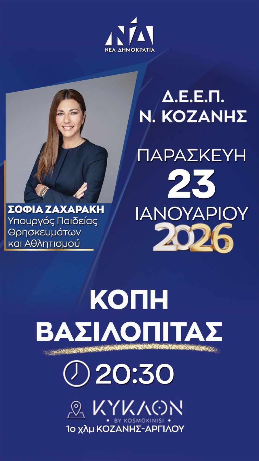 Η Διοικούσα Επιτροπή Εκλογικής Περιφέρειας (Δ.Ε.Ε.Π.) Ν. Κοζάνης της Νέας Δημοκρατίας σας προσκαλεί στην κοπή της βασιλόπιτας