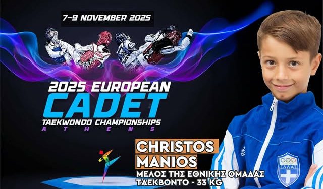 Στην πόλη της Αθήνας θα βρεθεί τις επόμενες ημέρες ο αθλητής και πρωταθλητής του συλλόγου μας Χρήστος Μάνιος του Νικολάου, προκειμένου να εκπροσωπήσει την Ελλάδα ως μέλος της Εθνικής Ομάδας Taekwondo στο Πανευρωπαϊκό Πρωτάθλημα Παίδων – Κορασίδων.