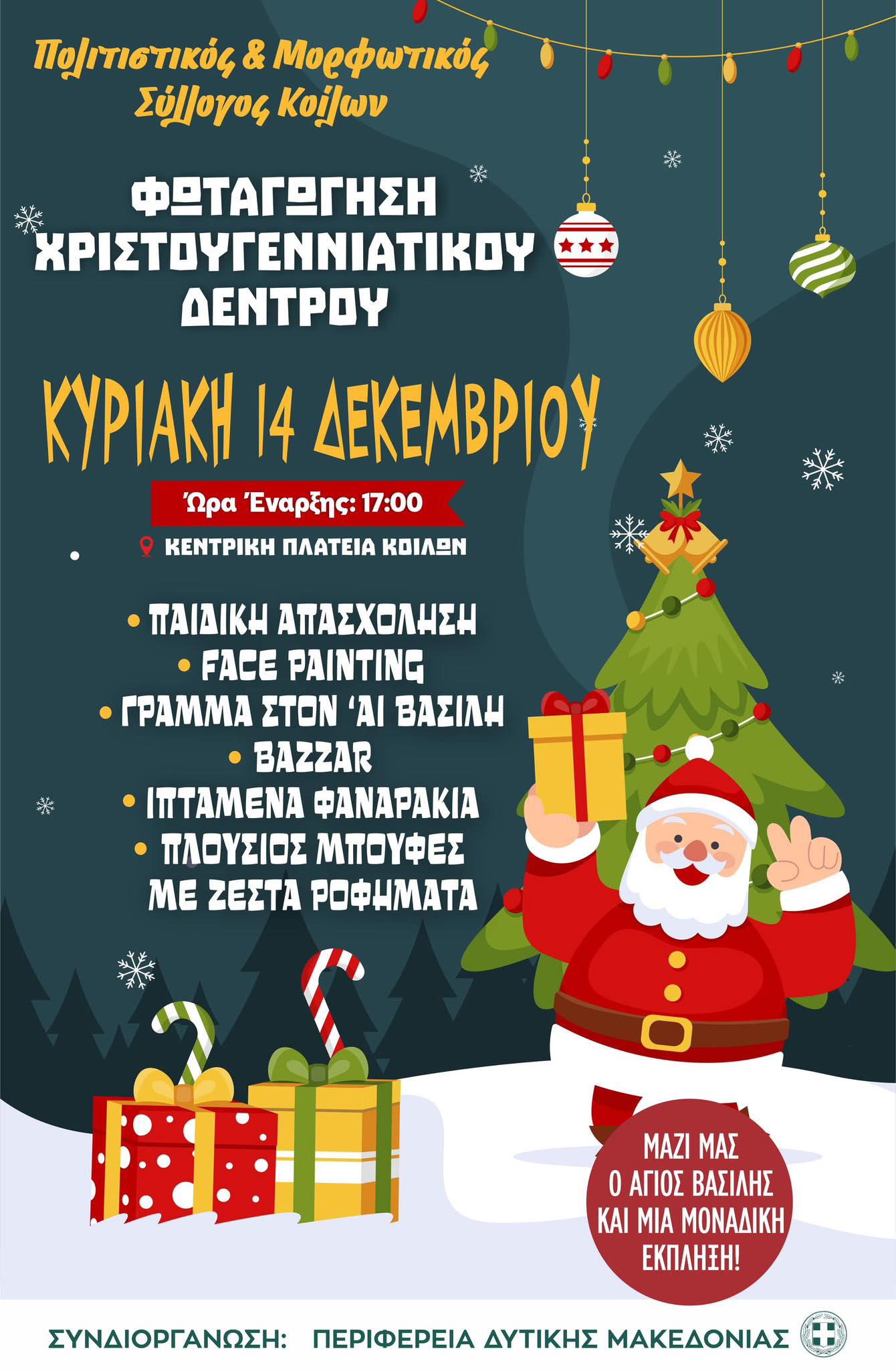 Σας περιμένουμε όλους Κυριακή 14 Δεκεμβρίου 5:00 μμ .. στην κεντρική πλατεία του χωριού… να ανάψουμε το δέντρο μας… παρέα με τον Αϊ-Βασίλη και πολλές εκπλήξεις….