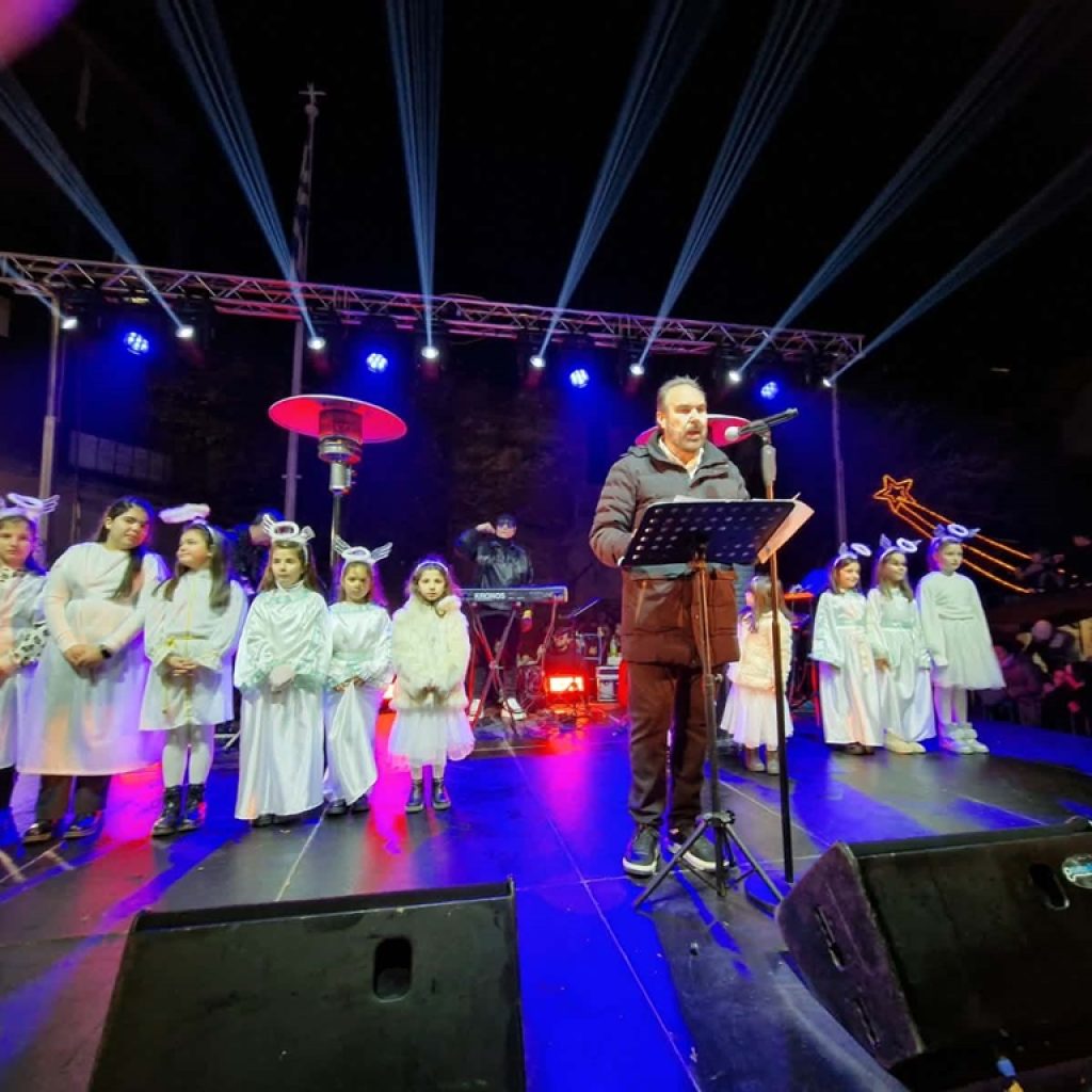 Καλωσορίζοντας όσους γέμισαν ασφυκτικά τον χώρο της κεντρικής πλατείας, ο κ. Γιαννάκης τους ευχαρίστησε για την παρουσία τους, όπως ευχαρίστησε και όσους συνέβαλλαν στην εκδήλωση, στη διοργάνωση του προγράμματος όλων των Χριστουγεννιάτικων εκδηλώσεων και στον στολισμό της πόλης.