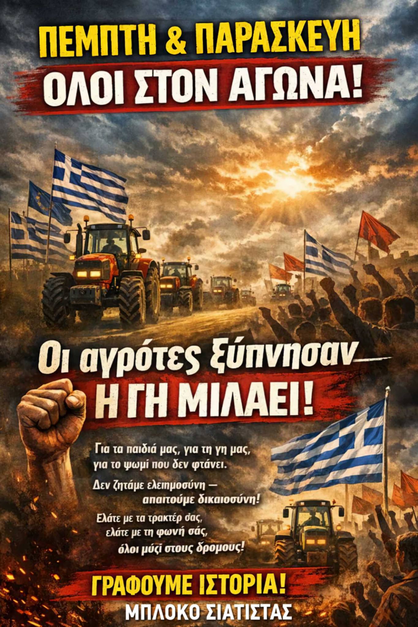 Ήρθε η ώρα να μιλήσει ξανά ο λαός της γης! Οι αγρότες, οι άνθρωποι που κρατάνε τη χώρα όρθια με σκασμένα χέρια και αδειανά πορτοφόλια, βγαίνουμε μπροστά. Όχι για τα ψίχουλα, όχι για υποσχέσεις — αλλά για το μέλλον μας, για το αύριο το δικό μας και των παιδιών μας. Την Πέμπτη και την Παρασκευή σηκώνουμε το κεφάλι, ενώνουμε φωνές και τρακτέρ, και γράφουμε ΙΣΤΟΡΙΑ. Δεν ζητάμε, απαιτούμε δικαιοσύνη, αξιοπρέπεια και σεβασμό. Γιατί χωρίς εμάς, δεν υπάρχει τροφή, δεν υπάρχει ζωή, δεν υπάρχει πατρίδα. Κανείς δεν θα παλέψει για εμάς — αν δεν παλέψουμε εμείς οι ίδιοι. Αυτός ο αγώνας είναι δίκαιος. Είναι λαϊκός. Είναι ο δικός μας αγώνας.