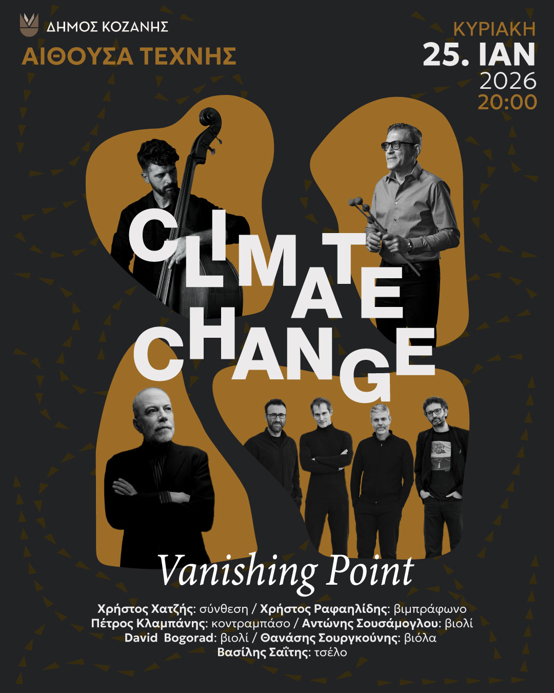 Μια μοναδική και συναρπαστική συνεργασία επτά μουσικών, που παρουσιάζουν το νέο τους άλμπουμ Vanishing Point, θα λάβει χώρα την Κυριακή 25 Ιανουαρίου 2026 στις 20:00 το βράδυ στην Αίθουσα Τέχνης της Κοζάνης, με ελεύθερη είσοδο για το κοινό.