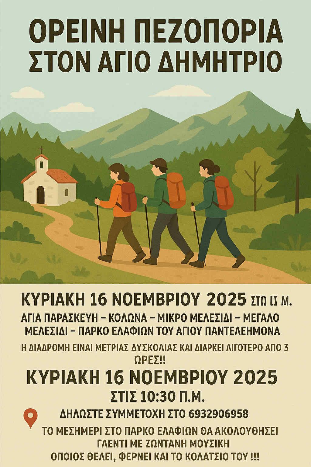 Ξεκινάμε από το εξωκκλήσι της Αγίας Παρασκευής, την Κυριακή 16 Νοεμβρίου 2025 στις 10:30 π.μ., με κατεύθυνση Κολώνα – Μικρό Μελεσίδι – Μεγάλο Μελεσίδη και καταλήγουμε στο Πάρκο Ελαφιών του Αγίου Παντελεήμονα.