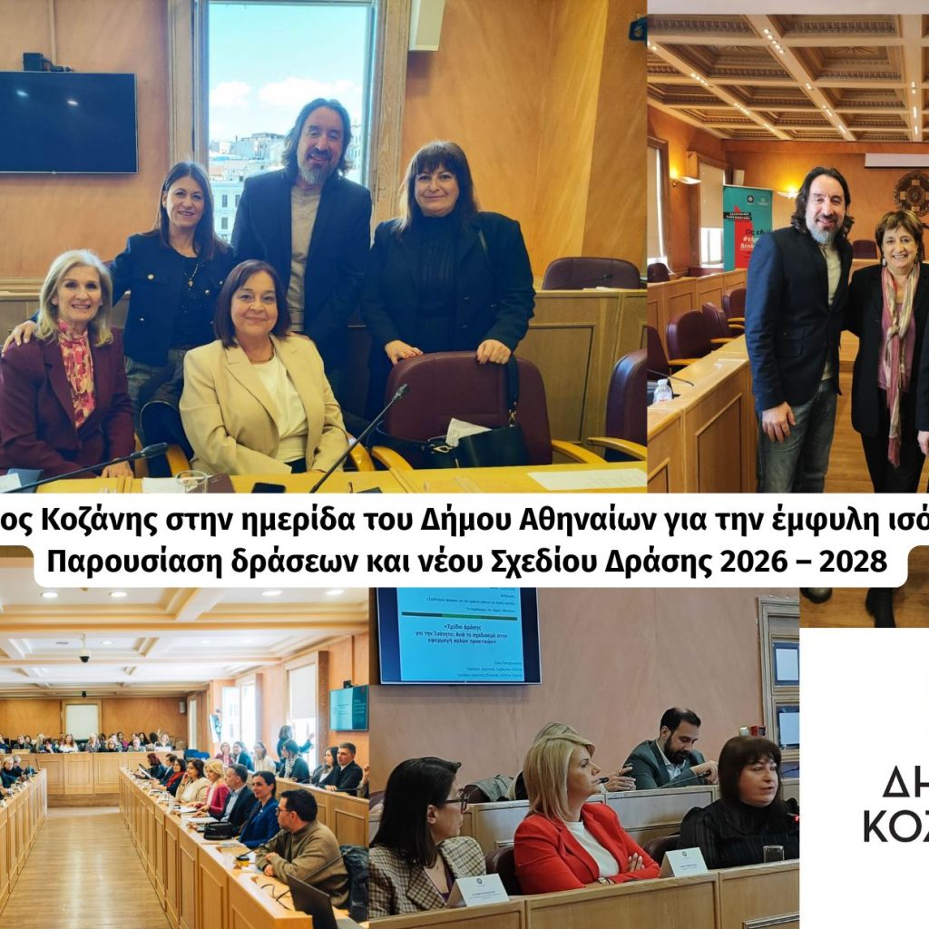 Ο Δήμος Κοζάνης, εκπροσωπούμενος από την Πρόεδρο του Δημοτικού Συμβουλίου και Πρόεδρο της Δημοτικής Επιτροπής Κοζάνης κ. Ελένη Παπαδοπούλου και τον Υπεύθυνο Έργου του Ξενώνα Φιλοξενίας Γυναικών Δήμου Κοζάνης κ. Δημήτρη Λεούδη, συμμετείχε στην ημερίδα με τίτλο «Σχεδιασμός δράσεων για την έμφυλη ισότητα σε τοπικό επίπεδο: Το παράδειγμα του Δήμου Αθηναίων», η οποία πραγματοποιήθηκε την Παρασκευή 13 Μαρτίου 2026 στο Δημαρχείο της Αθήνας, παρουσία του Δημάρχου Αθηναίων κ. Χάρη Δούκα.
