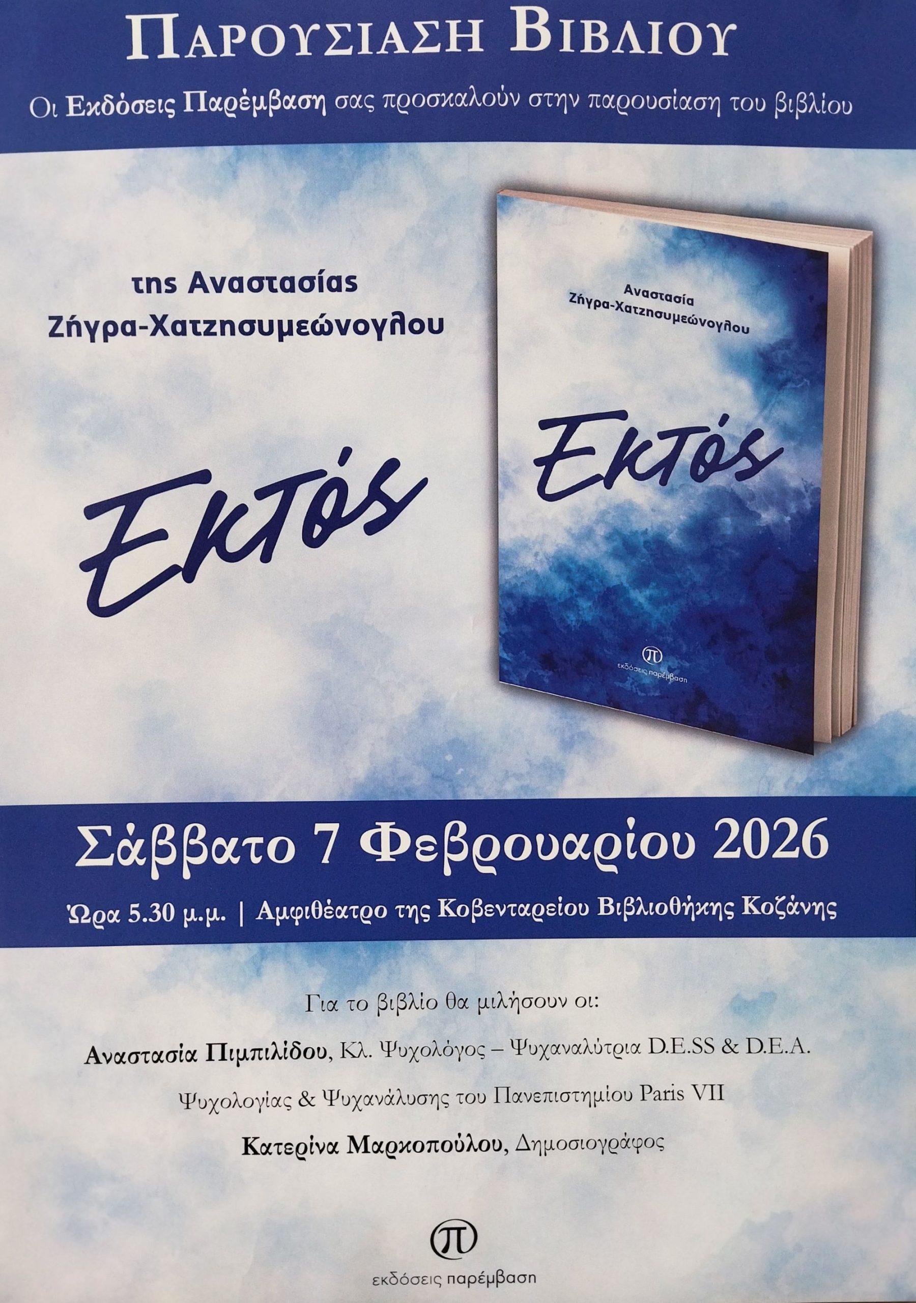 Ο Διευθυντής και ο σύλλογος Διδασκόντων Καθηγητών του 1ου Γυμνασίου Κοζάνης (Βαλταδώρειο), συγχαίρει τη μαθήτρια Ζήγρα-Χατζησυμεώνογλου Αναστασία της Γ΄τάξης του σχολείου μας και της εύχεται καλή επιτυχία στην παρουσίαση του βιβλίου της με τίτλο “Εκτός” το Σάββατο 7 Φεβρουαρίου 2026 και ώρα 5:30μ.μ. στο Αμφιθέατρο της Κοβενταρείου Βιβλιοθήκης Κοζάνης