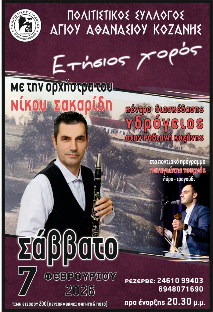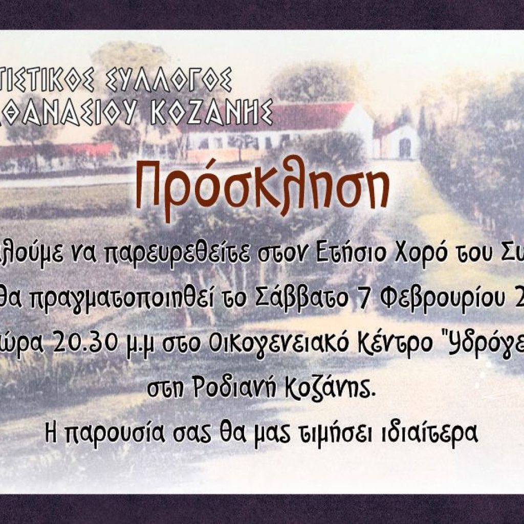 Ο Σύλλογός μας διοργανώνει τον ετήσιο καθιερωμένο χορό του στο οικογενειακό κέντρο « ΥΔΡΟΓΕΙΟΣ » στην Ροδιανή Κοζάνης. Καλούμε όλα τα μέλη, τους γείτονες, τους φίλους του συλλόγου Αγίου Αθανασίου και τους συμπολίτες μας το Σάββατο 7 Φεβρουαρίου στις 8.30΄μ.μ να συμμετέχουν όπως πάντα και να διασκεδάσουμε όλοι μαζί. Θα ξεφαντώσουμε με παραδοσιακά δημοτικά και ποντιακά τραγούδια.