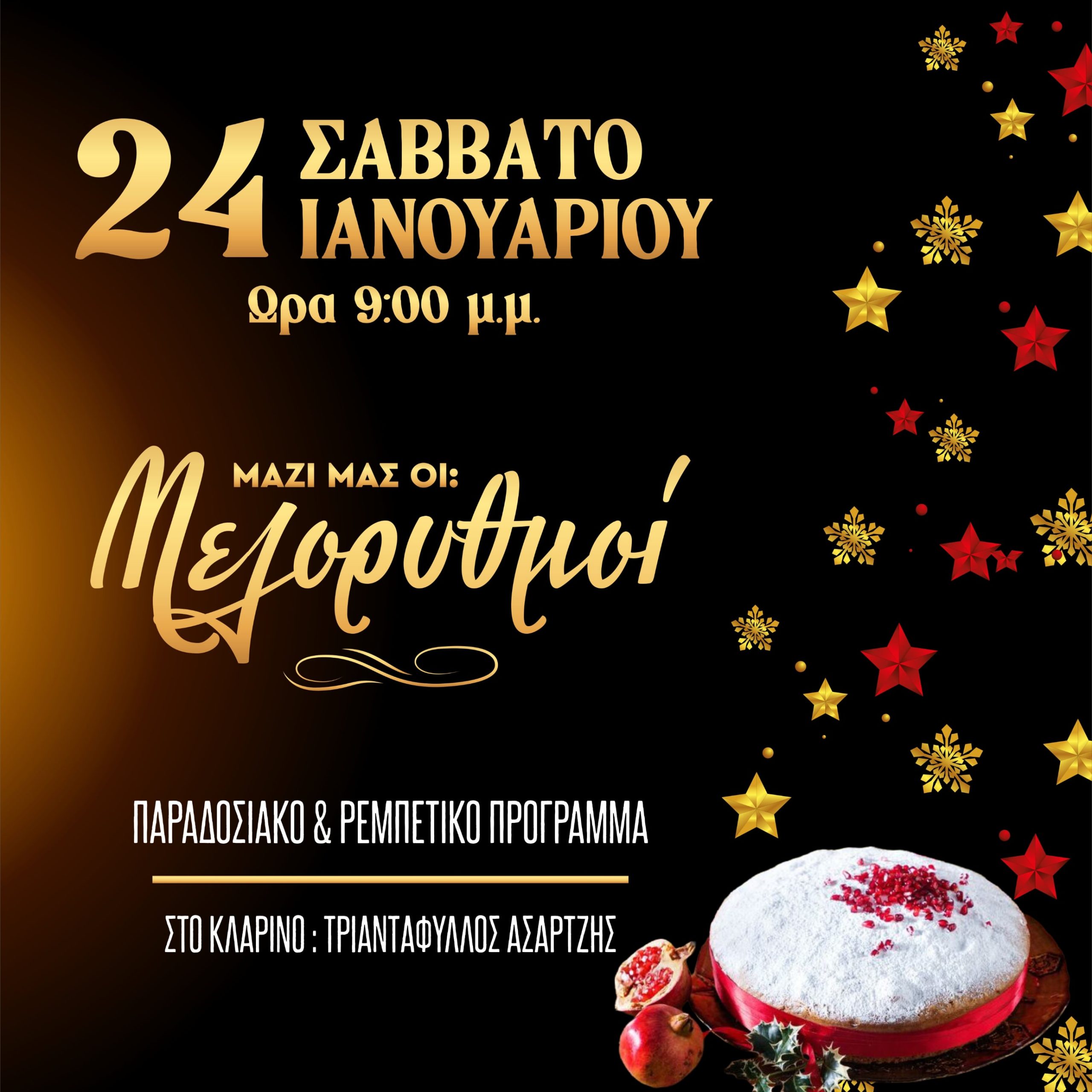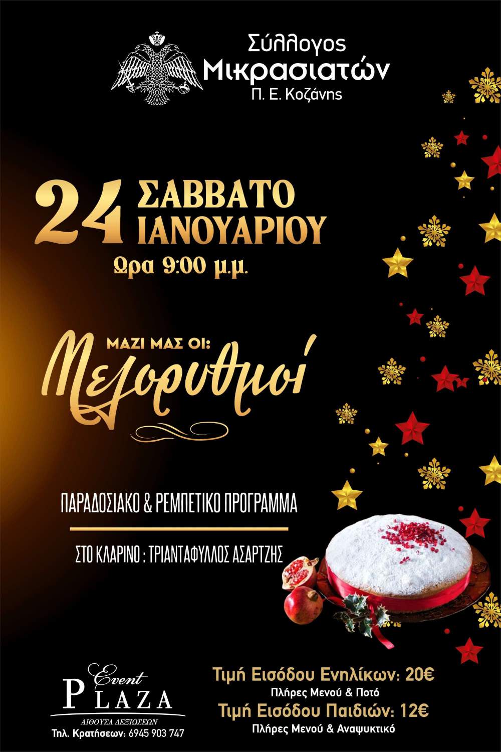 Σας καλούμε στο Event Plaza, το Σάββατο 24 Ιανουαρίου 2026 και ώρα 9:00 μ.μ. στον ετήσιο χορό μας, να κόψουμε τη βασιλόπιτα μας και να διασκεδάσουμε σε μικρασιάτικους και άλλους παραδοσιακούς χορούς.