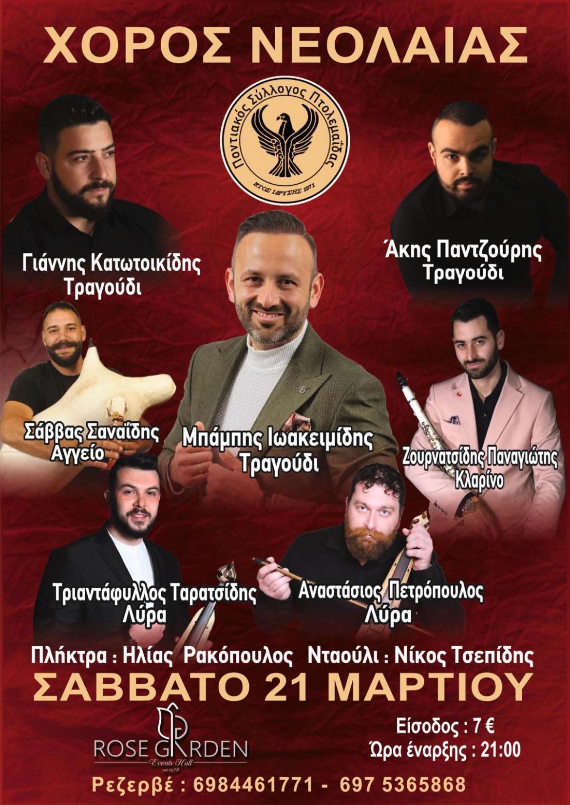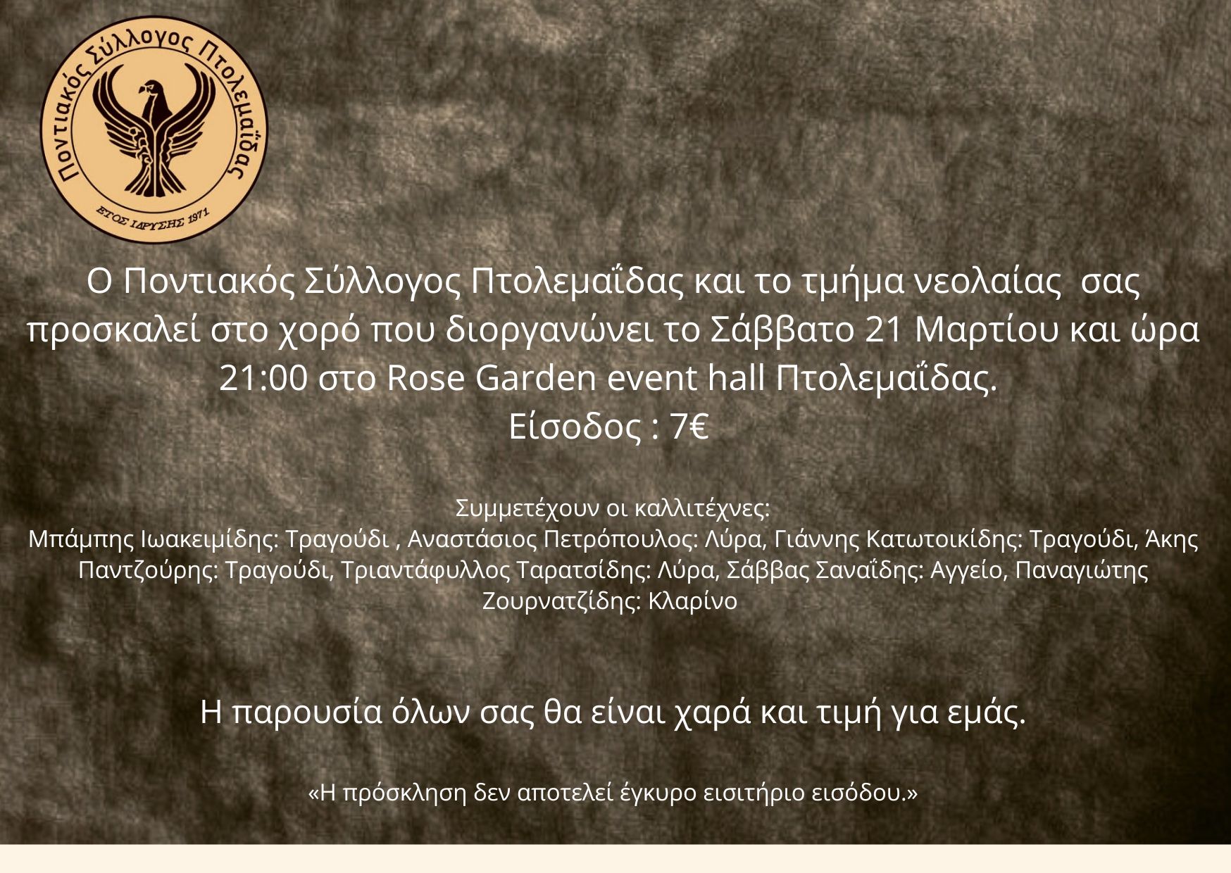 Ο Ποντιακός Σύλλογος Πτολεμαΐδας σας καλεί στον χορό που διοργανώνει το Τμήμα Νεολαίας του συλλόγου μας που θα πραγματοποιηθεί το Σάββατο 21 Μαρτίου 2026 στην Αίθουσα Εκδηλώσεων ROSE GARDEN. Ώρα έναρξης 21:00