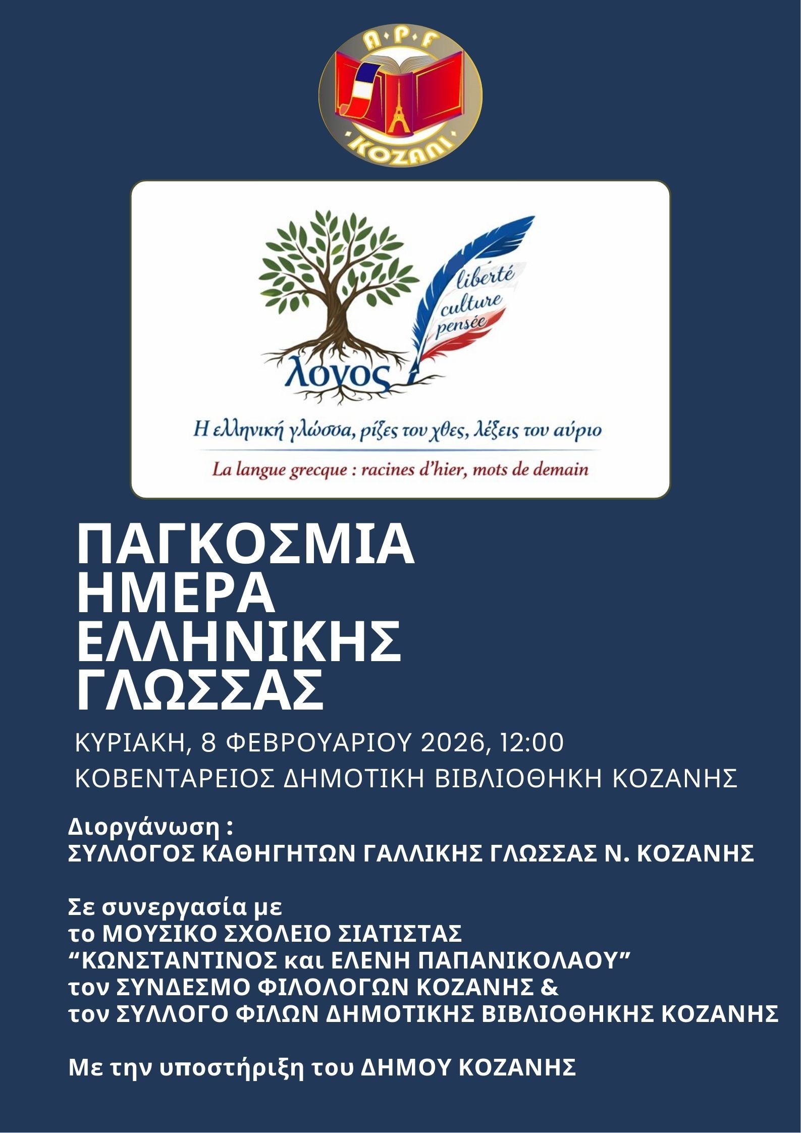Ο Σύλλογος Καθηγητών Γαλλικής Γλώσσας Νομού Κοζάνης τιμά την Παγκόσμια Ημέρα Ελληνικής Γλώσσας με ειδική εκδήλωση που θα πραγματοποιηθεί την Κυριακή 8 Φεβρουαρίου 2026 και ώρα 12:00 μ.μ., στην Κοβεντάρειο Δημοτική Βιβλιοθήκη Κοζάνης.