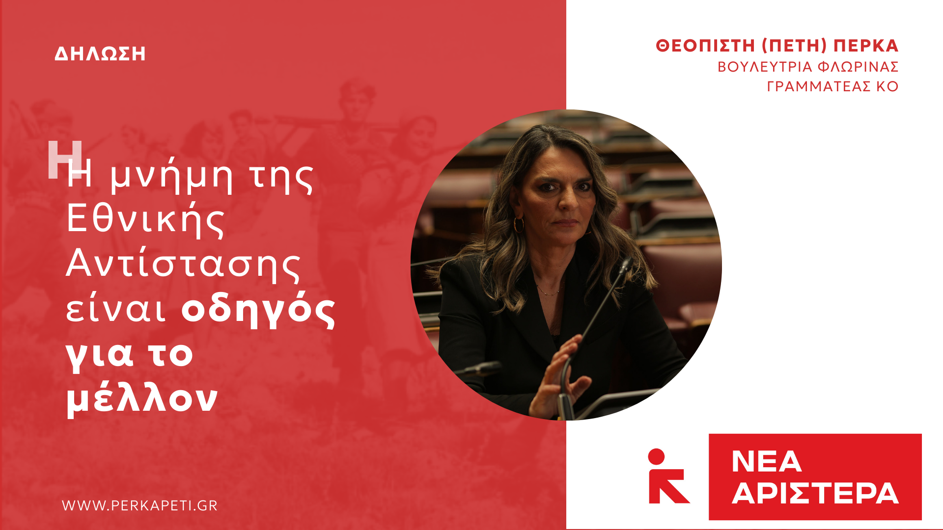 Ως Νέα Αριστερά, δεν τιμούμε την Αντίσταση μόνο ως κομμάτι του παρελθόντος. Τη φέρνουμε στο σήμερα. Ως υπενθύμιση ότι οι κοινωνίες αλλάζουν από τα κάτω. Ότι η ελπίδα γεννιέται από τη συλλογική δράση. Ότι η ελευθερία δεν είναι δεδομένη, αλλά κατακτιέται.